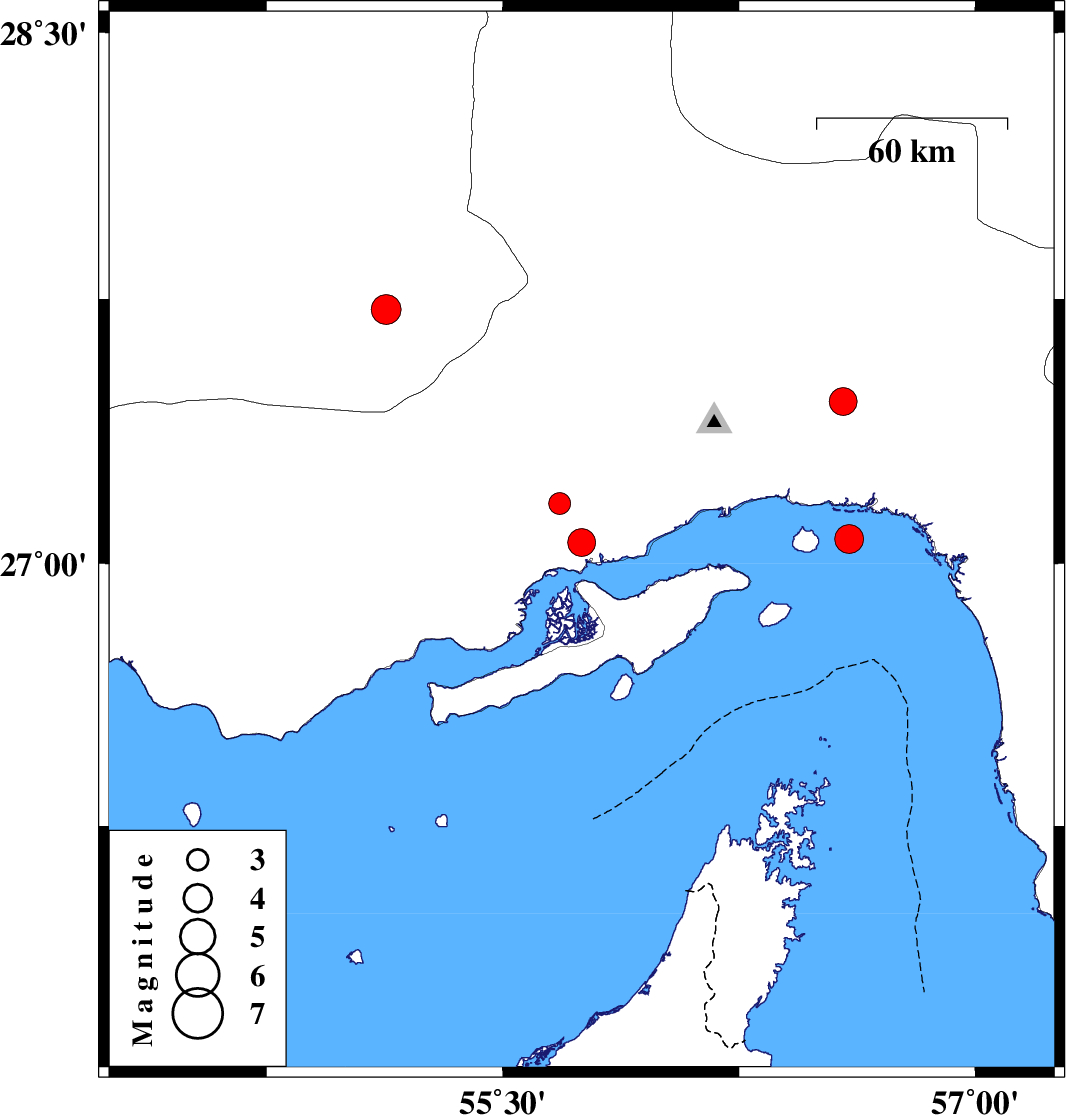 | 2006/11/18 | 01:05:09.1 | 04:35:09.1 | 27.06 | 55.75 | 15 | ML:4 | 52 km North-West of Qeshm, Hormozgan Province | ||