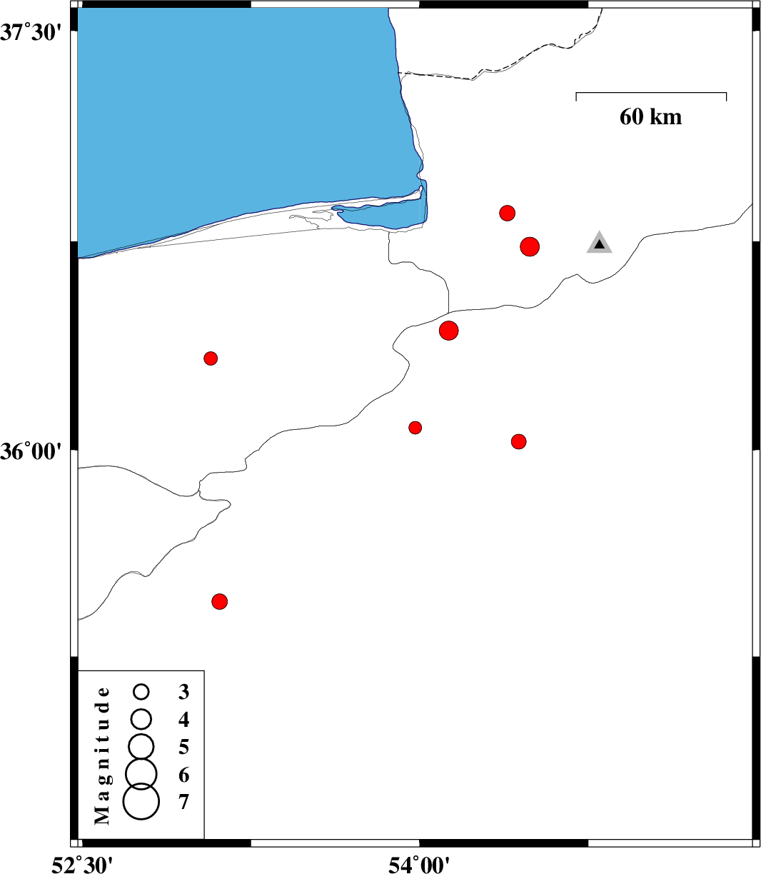 2006/11/02 | 00:58:01.5 | 04:28:01.5 | 36.73 | 54.49 | 16 | ML:3.8 | 12 km South of Gorgan, Golestan Province | ||