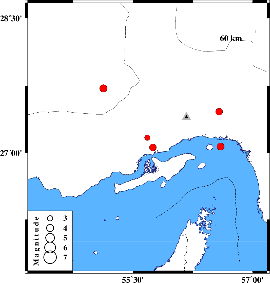 | 2006/11/18 | 01:05:09.1 | 04:35:09.1 | 27.06 | 55.75 | 15 | ML:4 | 52 km North-West of Qeshm, Hormozgan Province | ||
