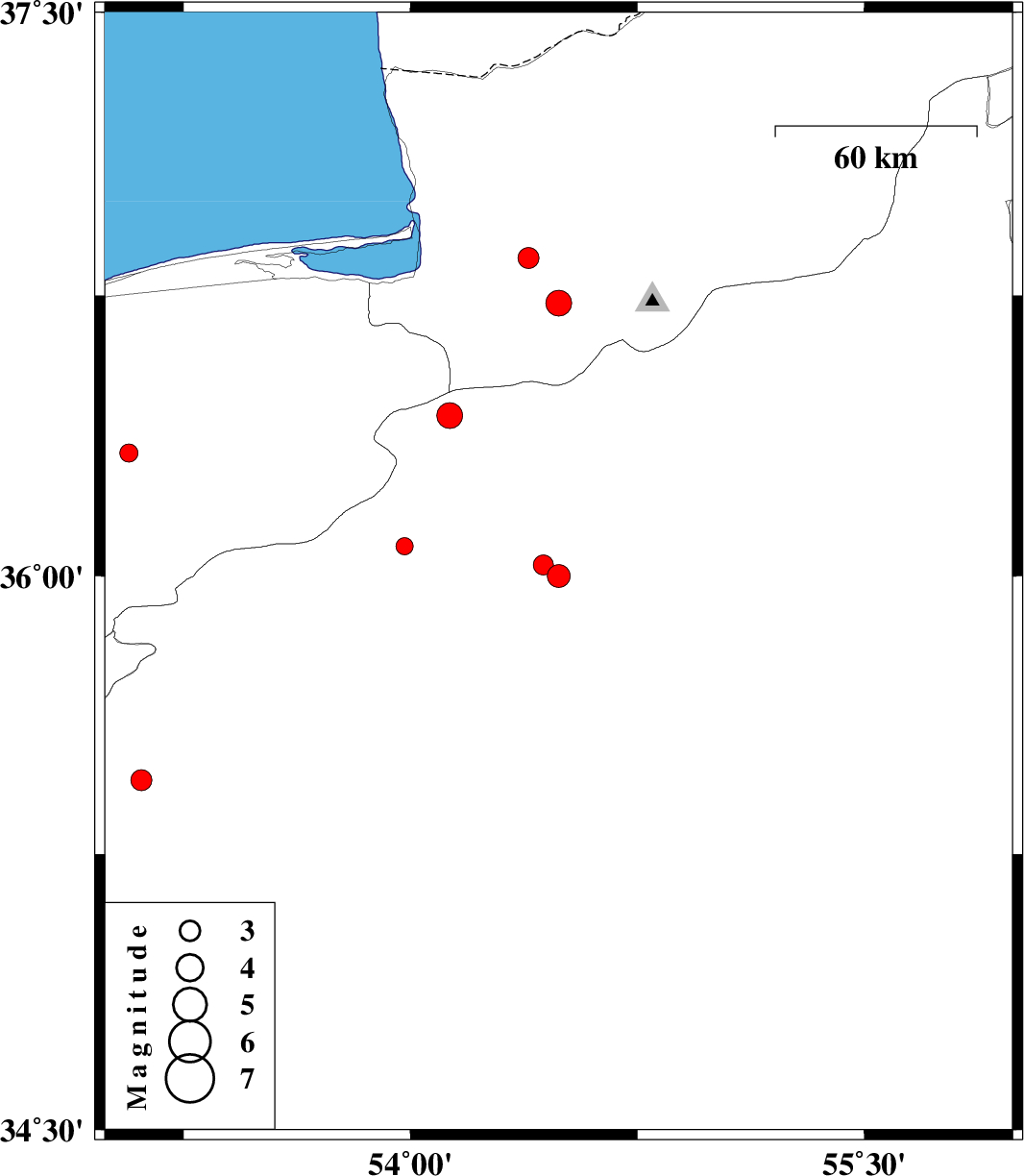 2006/11/02 | 00:58:01.5 | 04:28:01.5 | 36.73 | 54.49 | 16 | ML:3.8 | 12 km South of Gorgan, Golestan Province | ||