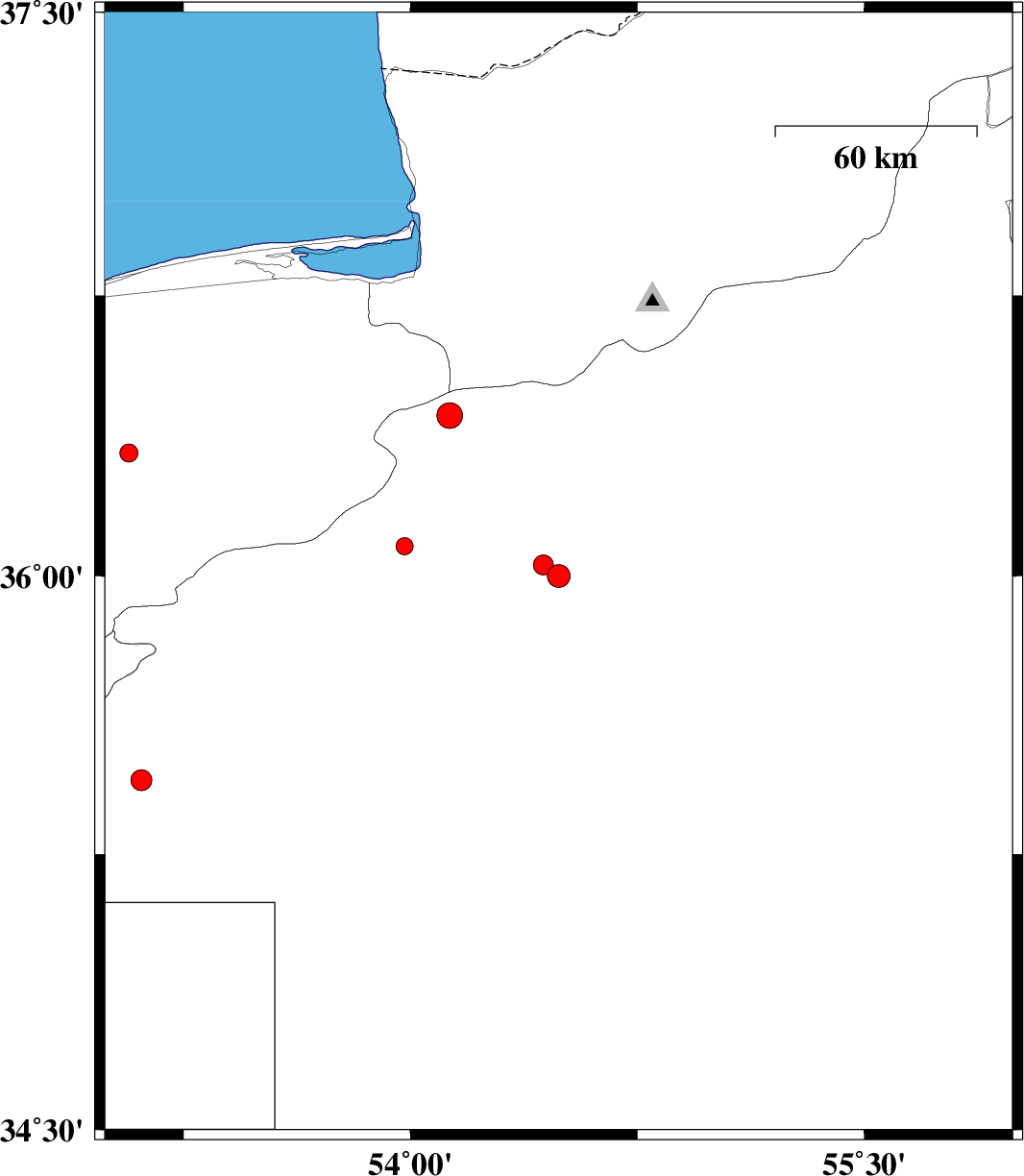 | 2006/11/12 | 17:22:01.8 | 20:52:01.8 | 36.03 | 54.44 | 14 | ML:3 | 17 km South of Damghan, Semnan Province |