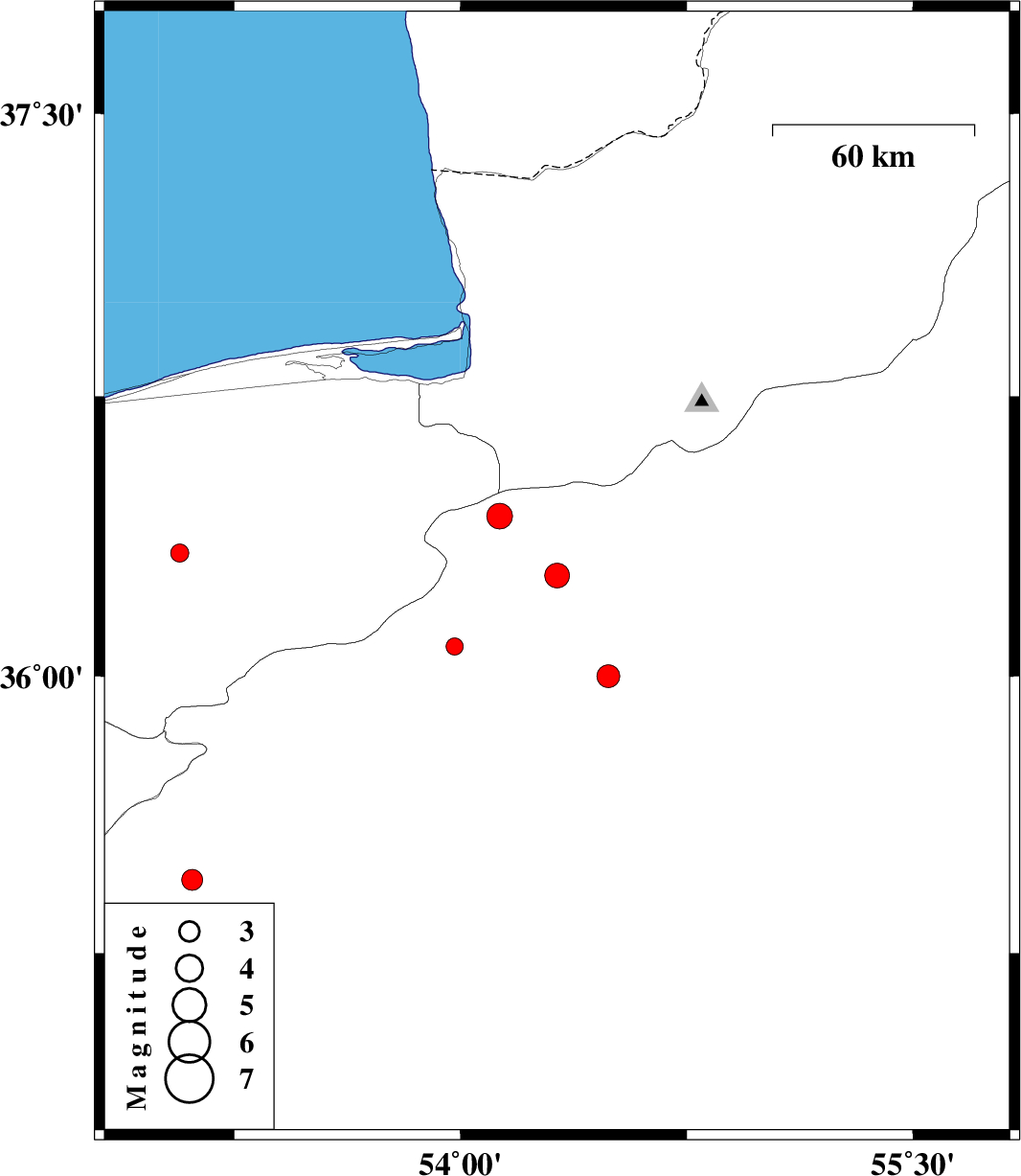 2006/11/19 | 06:55:45.9 | 10:25:45.9 | 36 | 54.49 | 14 | ML:3.4 | 22 km South-East of Damghan, Semnan Province | ||