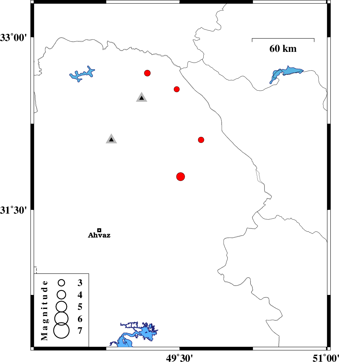 | 2006/11/23 | 12:21:32.2 | 15:51:32.2 | 31.79 | 49.51 | 18 | ML:3.8 | 25 km South-East of Masjed Soleyman, Khoozestan Province | ||