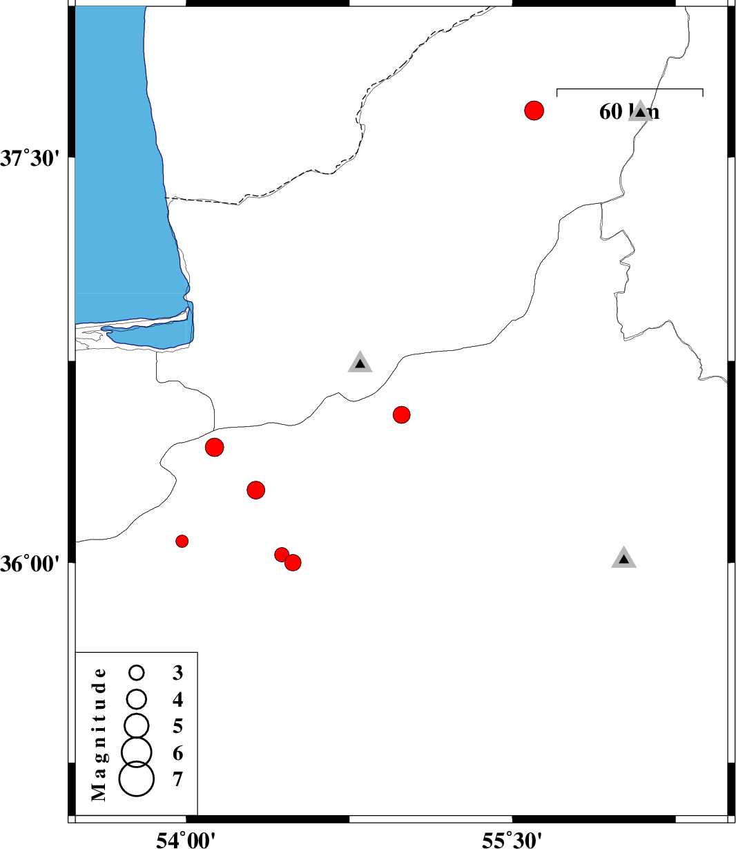 2006/11/19 | 06:55:45.9 | 10:25:45.9 | 36 | 54.49 | 14 | ML:3.4 | 22 km South-East of Damghan, Semnan Province | ||