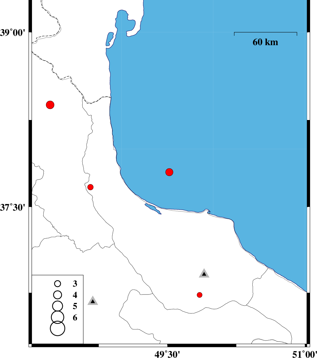 2006/12/11 | 14:46:15.3 | 18:16:15.3 | 37.8 | 49.52 | 14 | ML:3.6 | Caspian Sea, 36 km North of Bandar-e anzali | ||