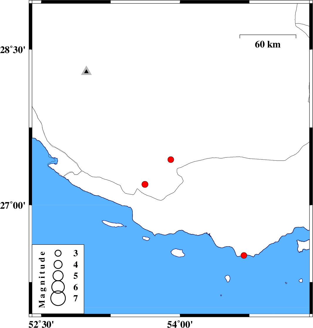 | 2006/12/28 | 20:15:49.4 | 23:45:49.4 | 26.51 | 54.69 | 14 | ML:2.9 | 16 km West of Bandar-e lengeh, Hormozgan Province | ||