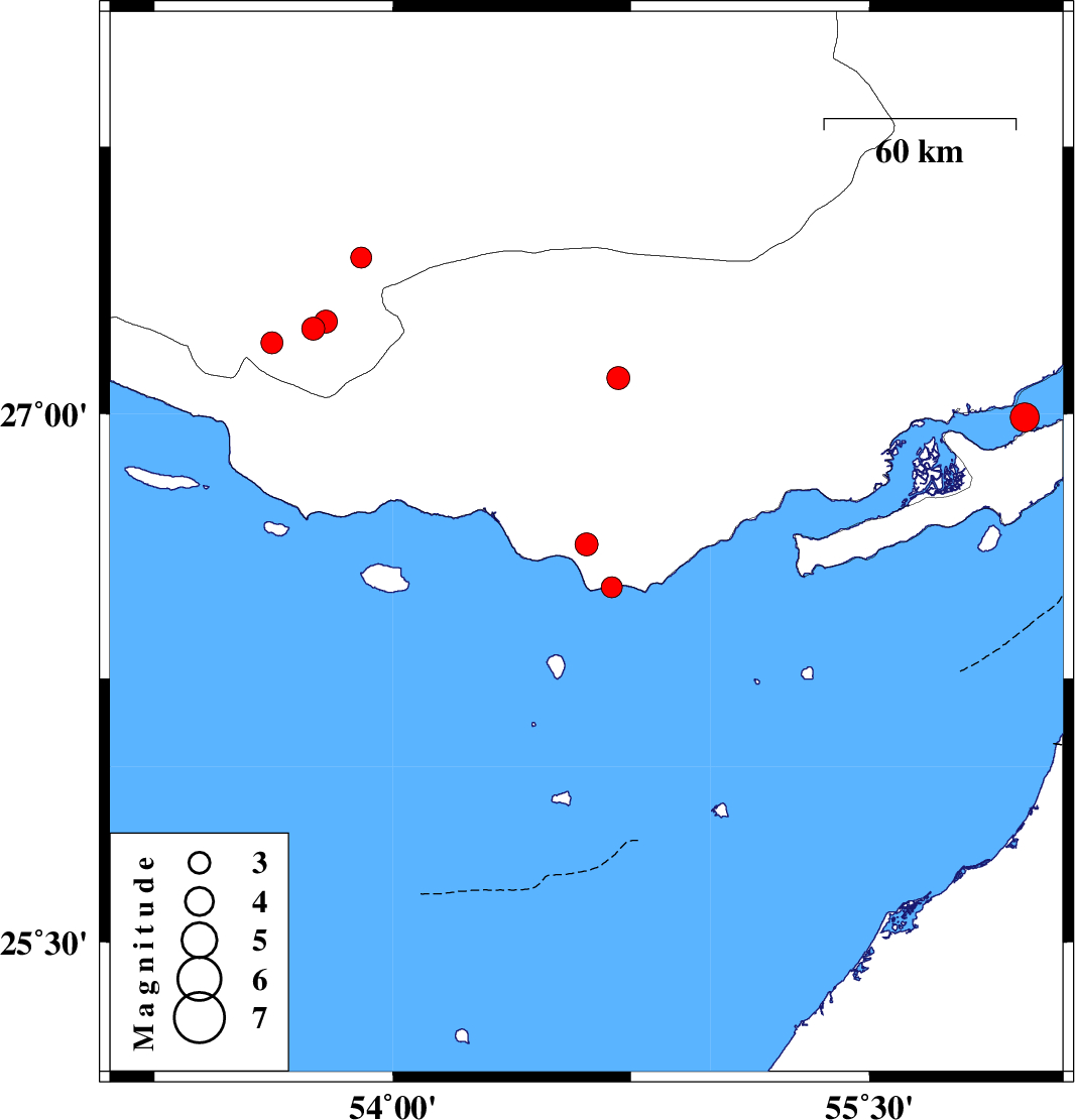 | 2007/01/05 | 03:16:05.7 | 06:46:05.7 | 26.63 | 54.61 | 37 | ML:3.3 | 26 km North-West of Bandar-e lengeh, Hormozgan Province | ||