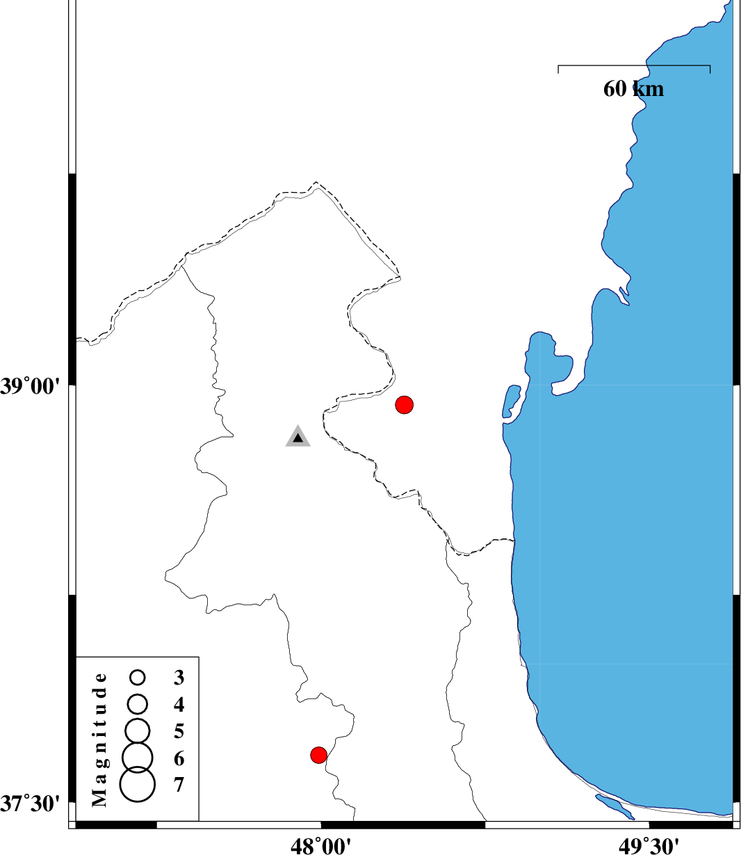 2007/01/15 | 21:07:50.1 | 00:37:50.1 | 38.93 | 48.38 | 30 | ML:3.7 | 26 km East of Germi, Ardebil Province | ||