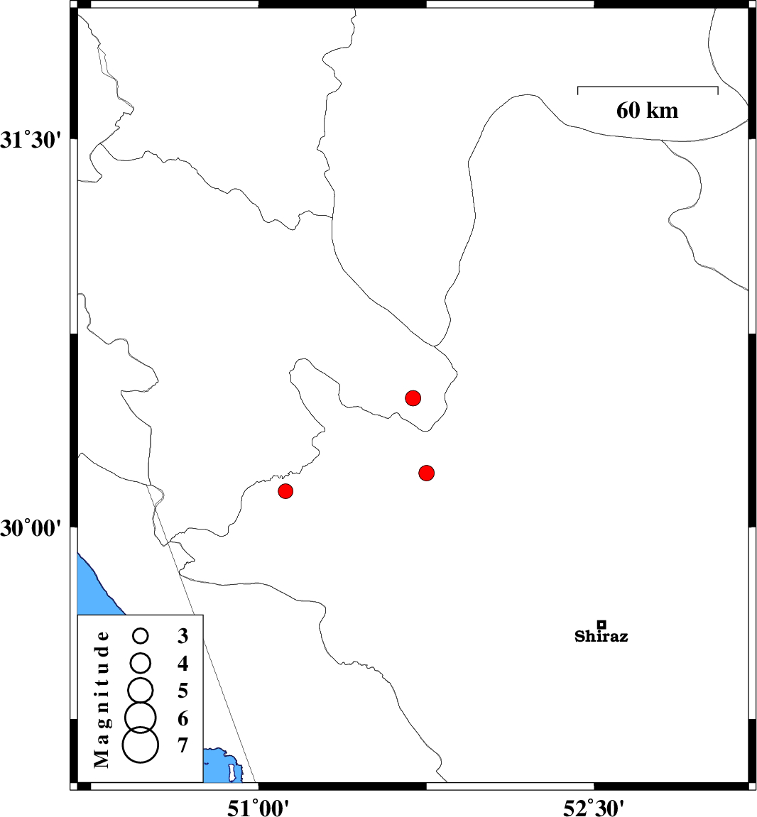 | 2007/01/12 | 02:30:37.9 | 06:00:37.9 | 30.21 | 51.75 | 14 | ML:3.1 | 23 km West of Ardakan, Fars Province |