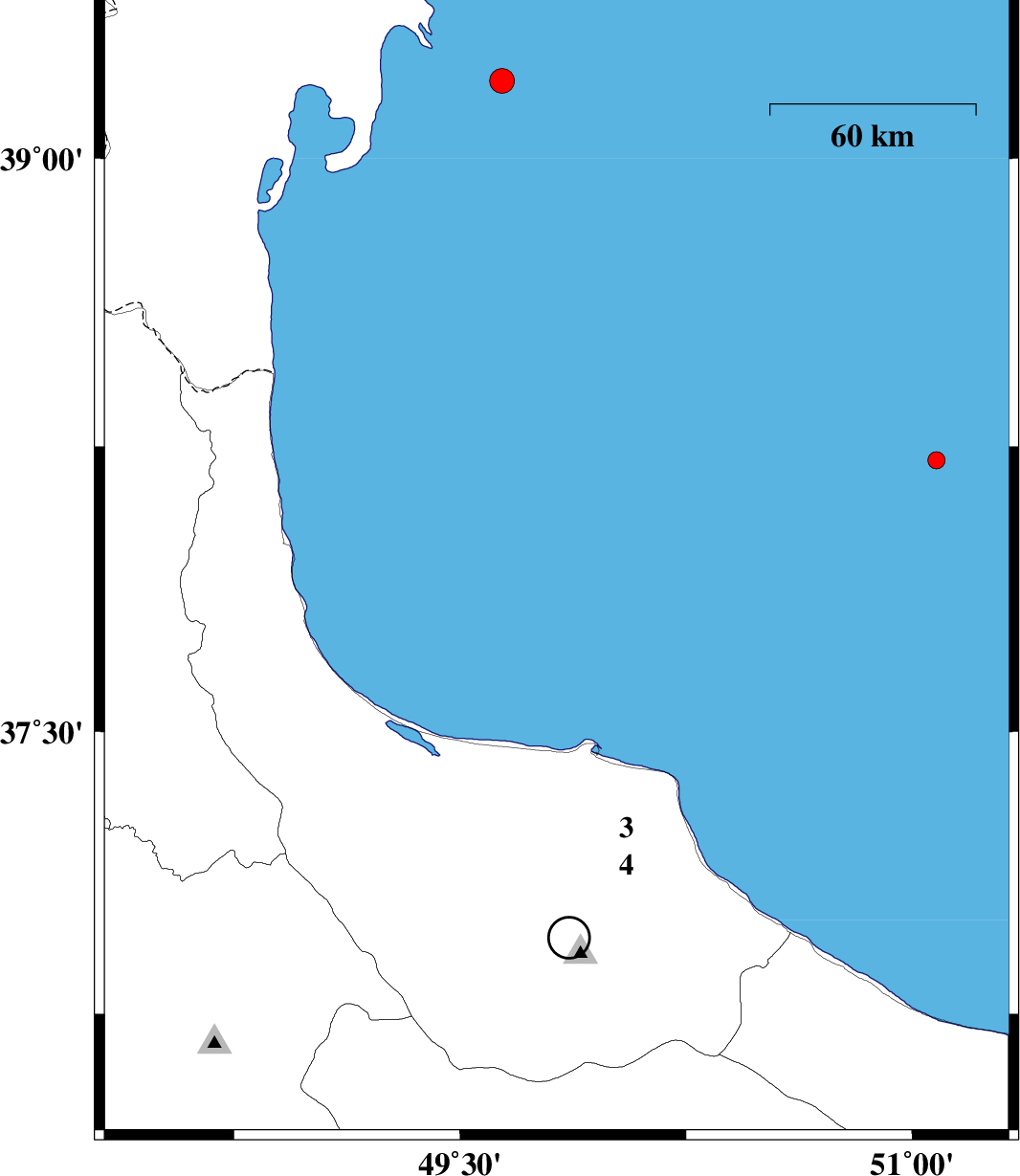 | 2007/01/21 | 05:31:14.2 | 09:01:14.2 | 37.94 | 49.82 | 14 | ML:2.6 | Caspian Sea, 59 km North-East of Bandar-e anzali | ||