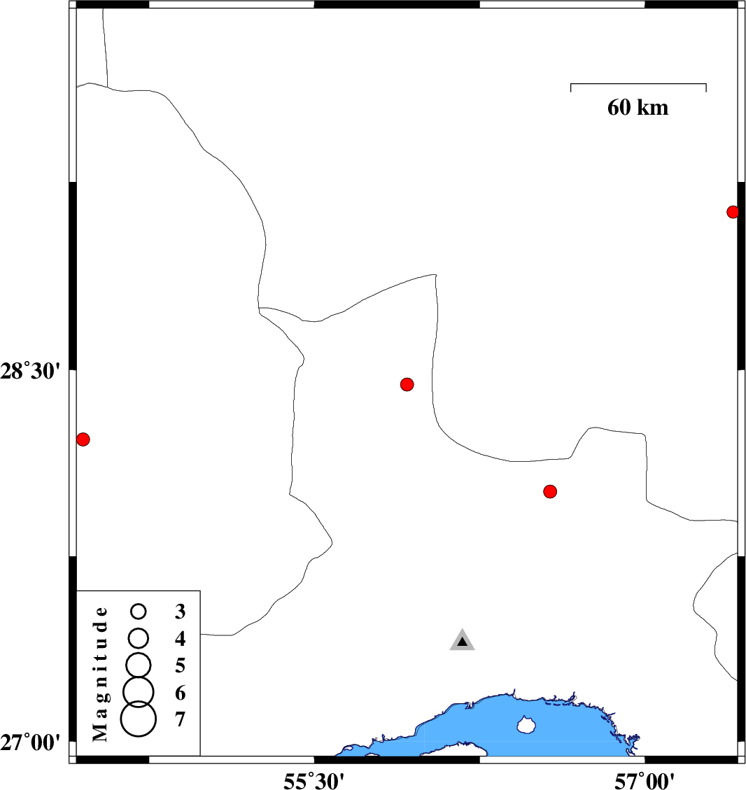 | 2007/01/29 | 00:00:29.1 | 03:30:29.1 | 28.44 | 55.92 | 18 | ML:2.7 | 15 km North of Hajiabad, Hormozgan Province | ||