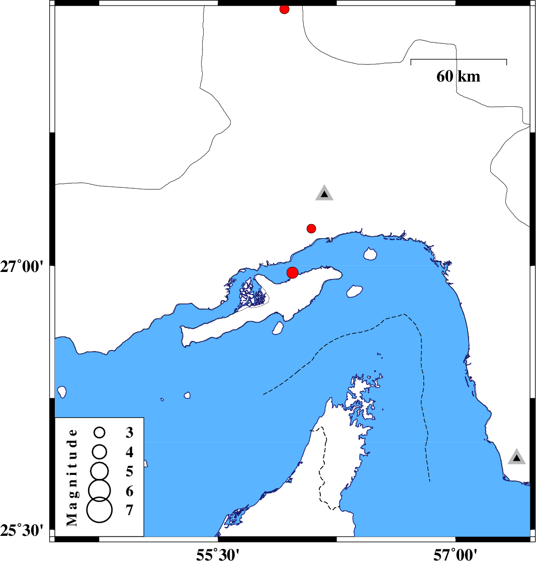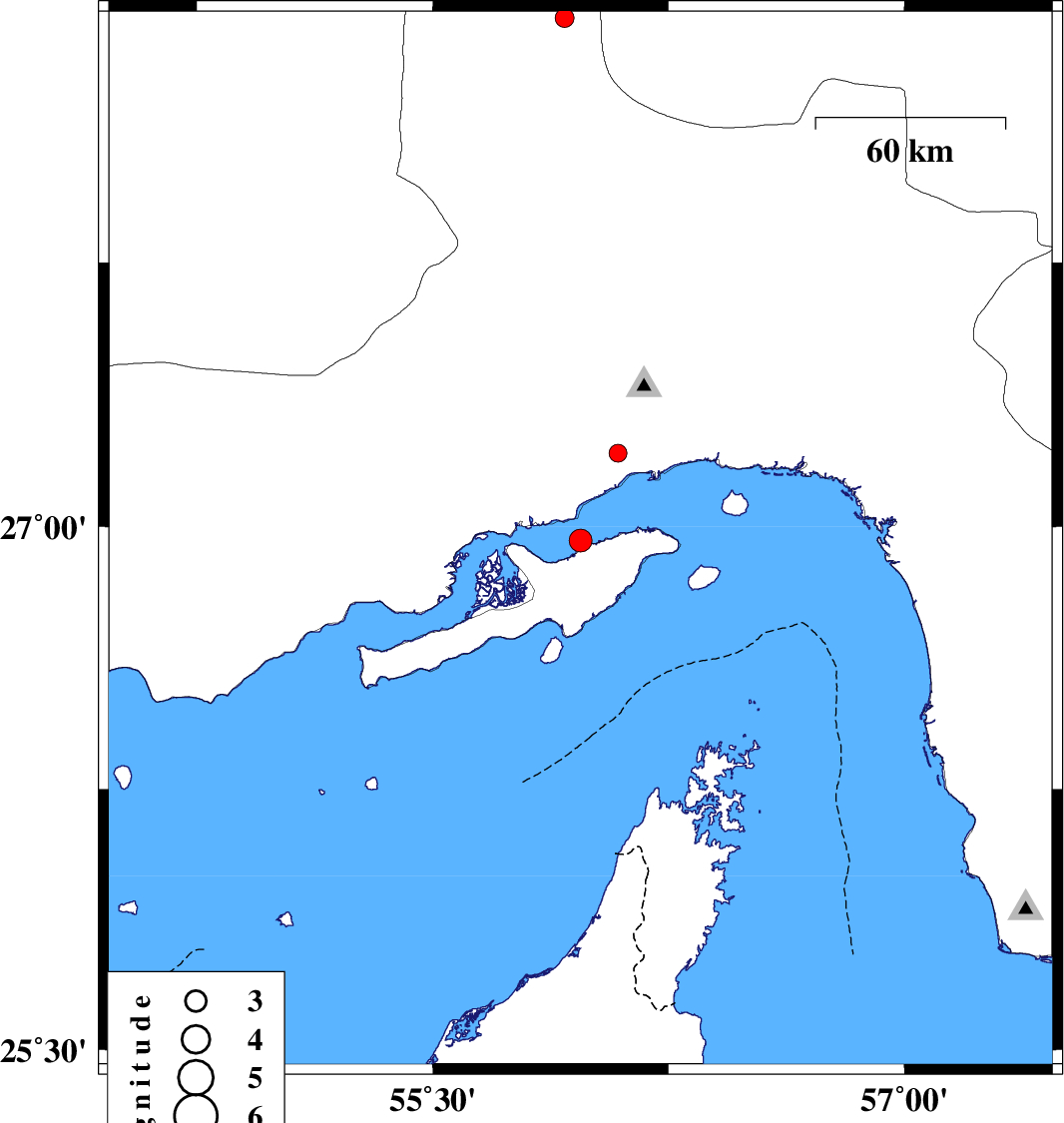 | 2007/01/31 | 14:13:02.6 | 17:43:02.6 | 26.96 | 55.97 | 15 | ML:3.3 | Persian Gulf, 29 km West of Qeshm | ||