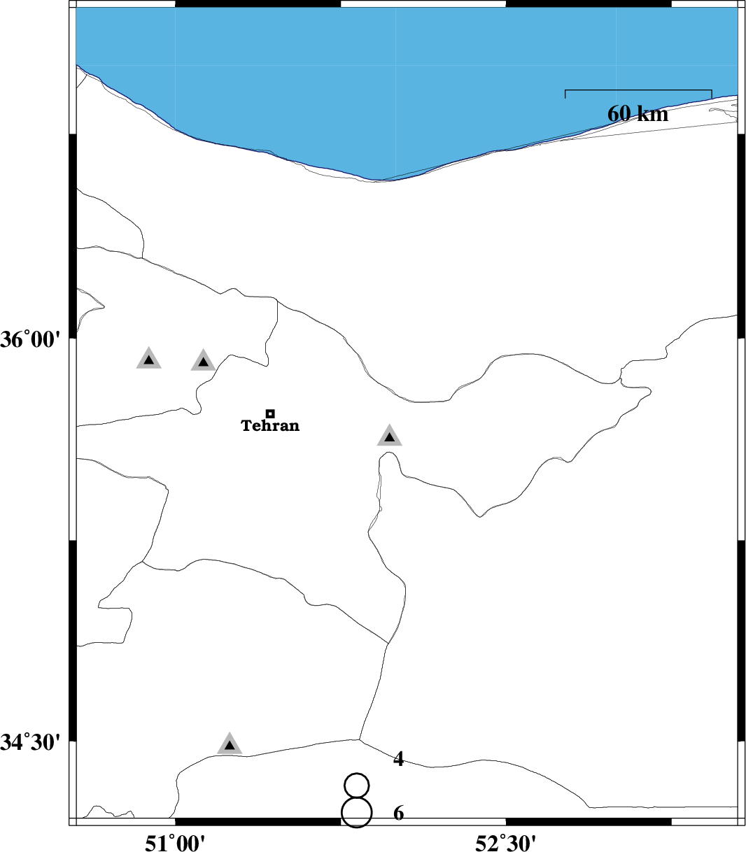 | 2007/02/26 | 19:43:06.0 | 23:13:06.0 | 35.71 | 52.05 | 14 | ML:3.4 | 2 km Damavand, Tehran Province |
