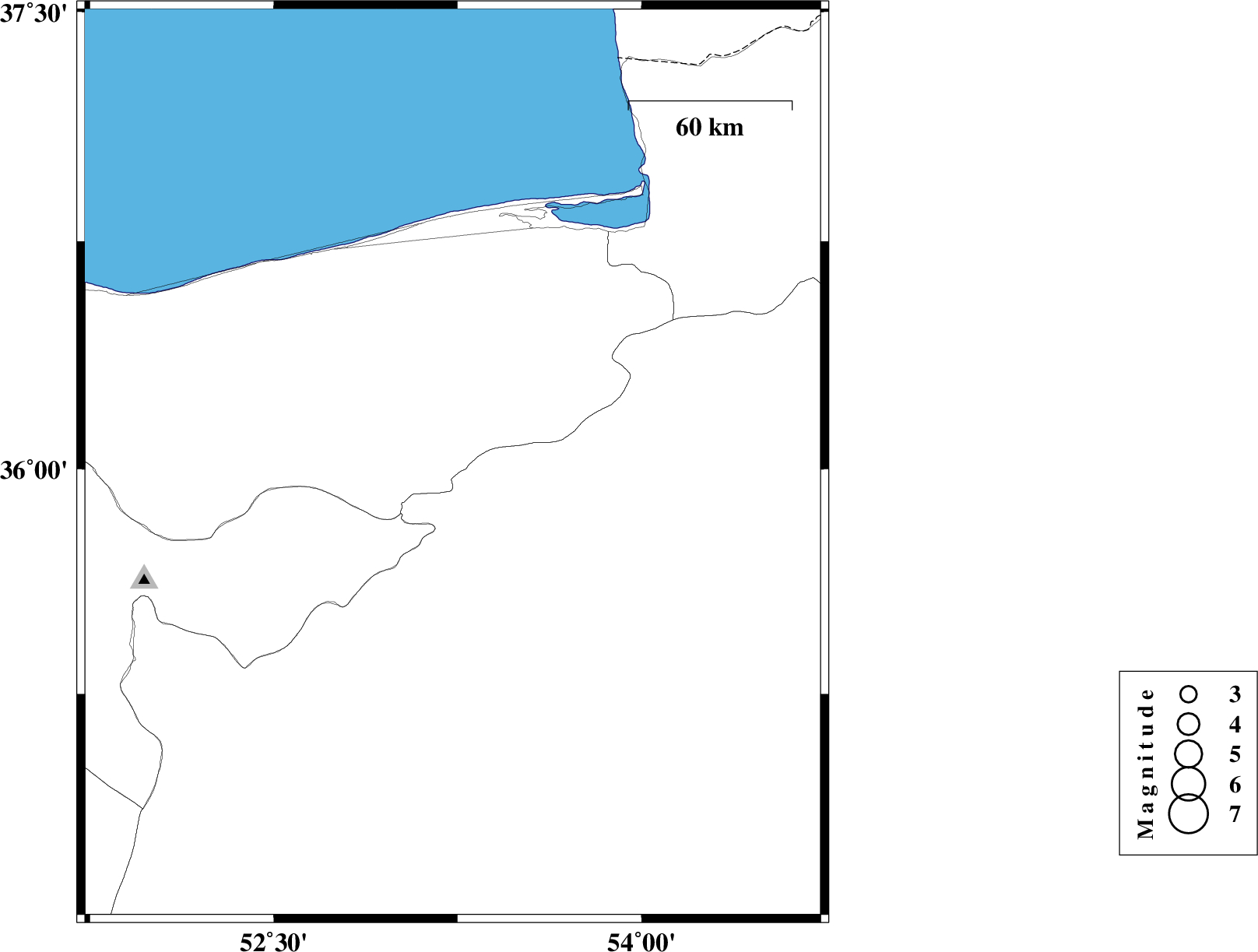 | 2007/02/22 | 08:50:43.4 | 12:20:43.4 | 36.83 | 53.88 | 14 | ML:2.8 | Caspian Sea, 9 km Bandar-e gaz | ||