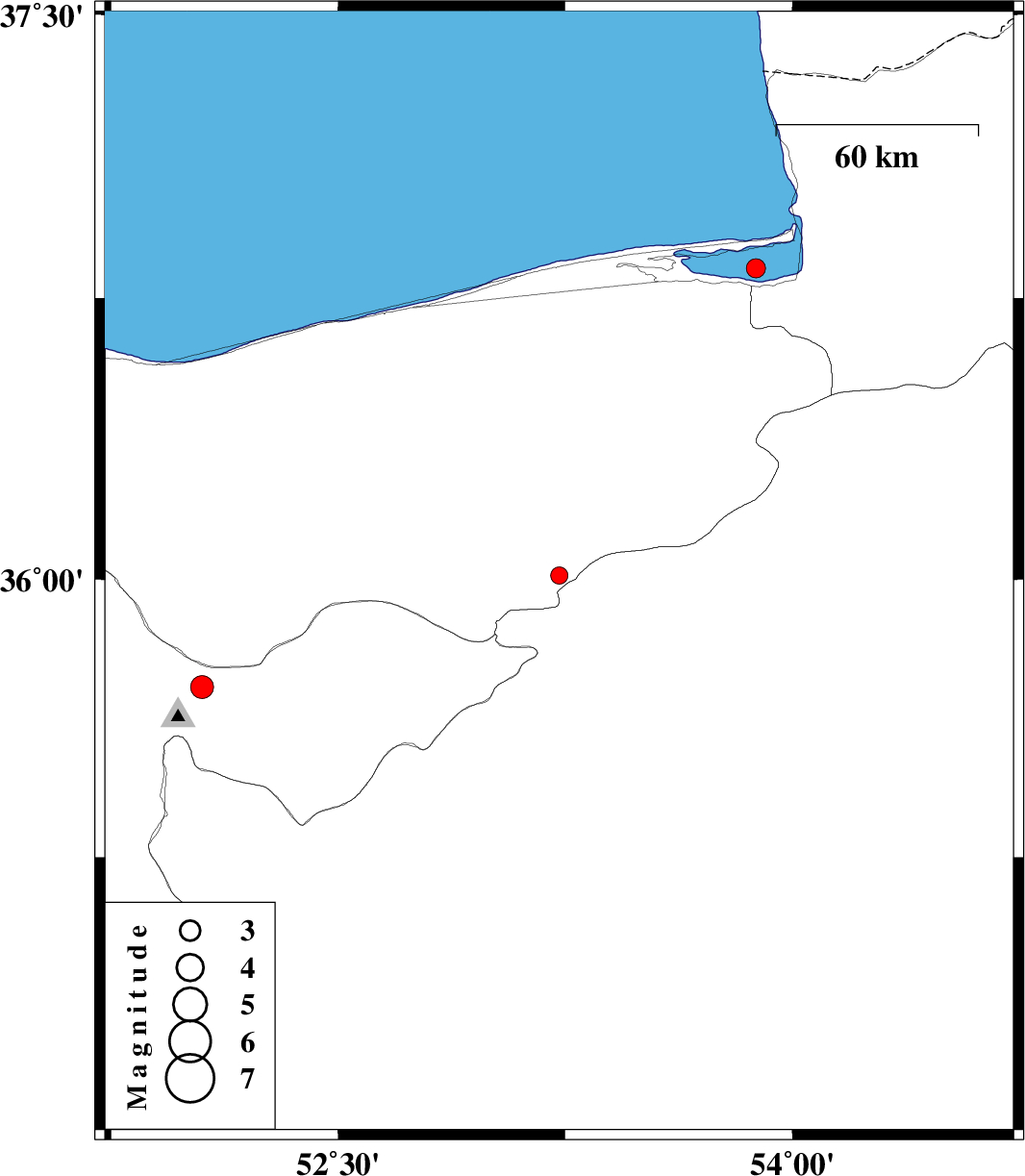 | 2007/02/22 | 08:50:43.4 | 12:20:43.4 | 36.83 | 53.88 | 14 | ML:2.8 | Caspian Sea, 9 km Bandar-e gaz |