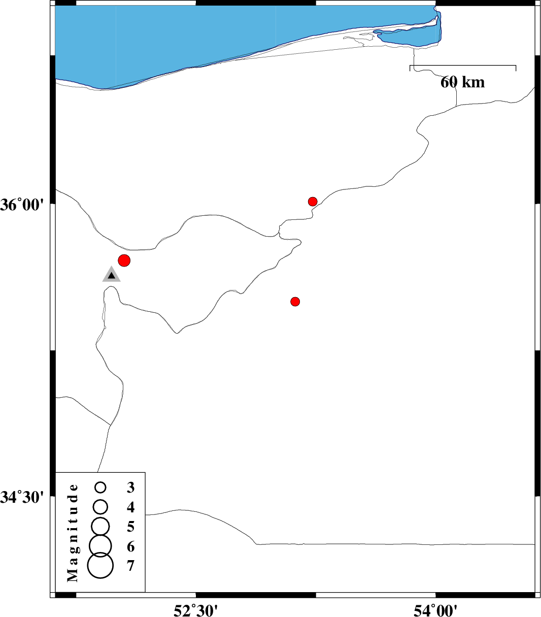 | 2007/02/26 | 19:43:06.0 | 23:13:06.0 | 35.71 | 52.05 | 14 | ML:3.4 | 2 km Damavand, Tehran Province |