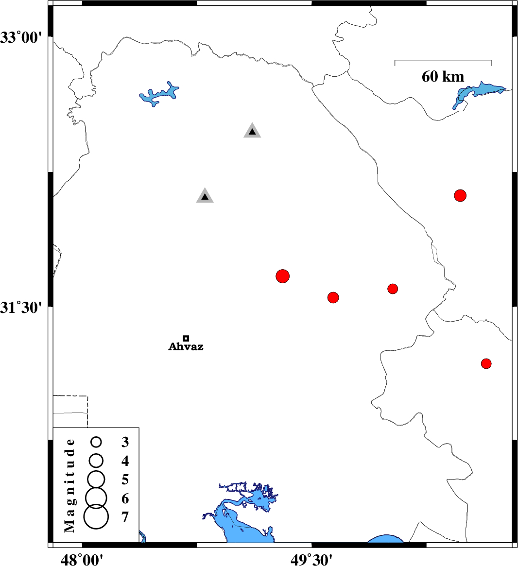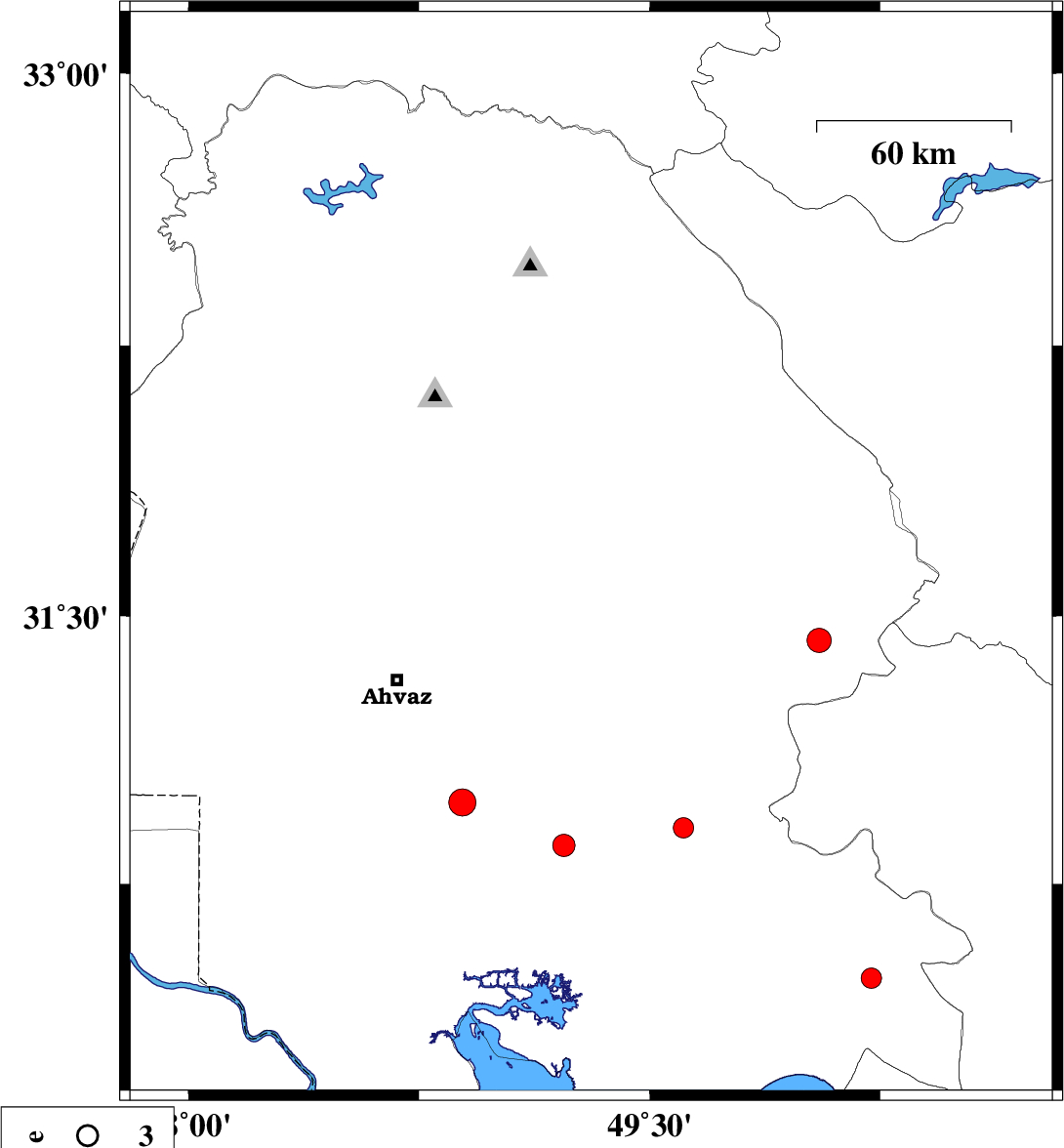| 2007/03/06 | 05:53:59.6 | 09:23:59.6 | 31.6 | 50.03 | 25 | ML:2.9 | 15 km East of Bagh Malek, Khoozestan Province | ||