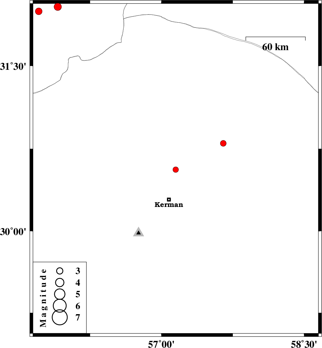 | 2007/03/09 | 18:15:12.0 | 21:45:12.0 | 30.8 | 57.65 | 14 | ML:2.8 | 79 km North-East of Kerman, Kerman Province | ||