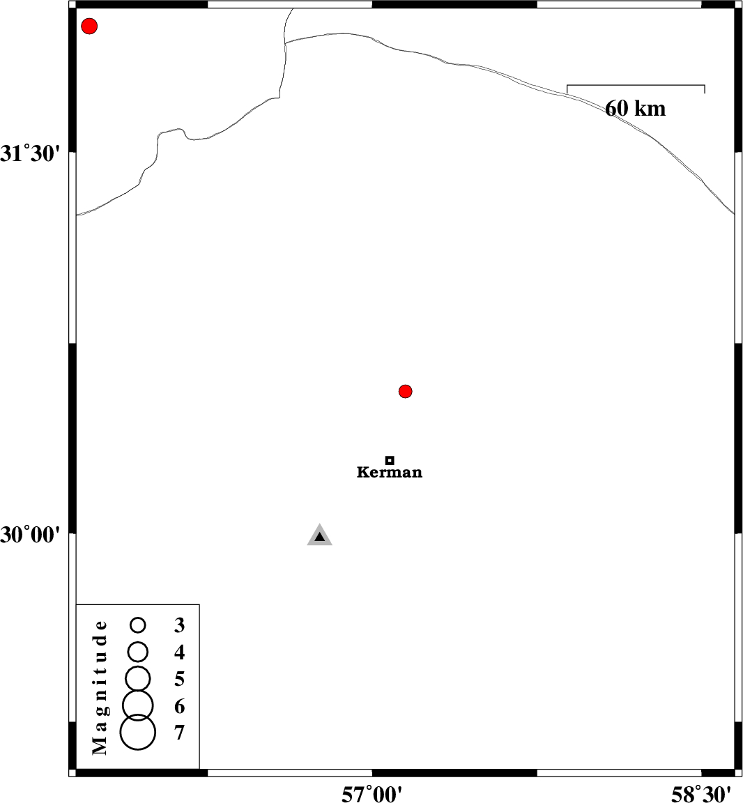 | 2007/03/20 | 22:25:46.2 | 01:55:46.2 | 30.56 | 57.15 | 14 | ML:2.7 | 31 km North of Kerman, Kerman Province | ||