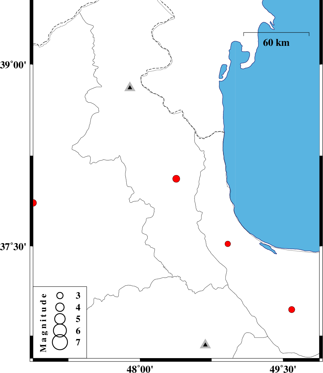 | 2007/03/20 | 09:22:48.0 | 12:52:48.0 | 36.97 | 49.59 | 14 | ML:3 | 22 km North-East of Rudbar, Gilan Province | ||