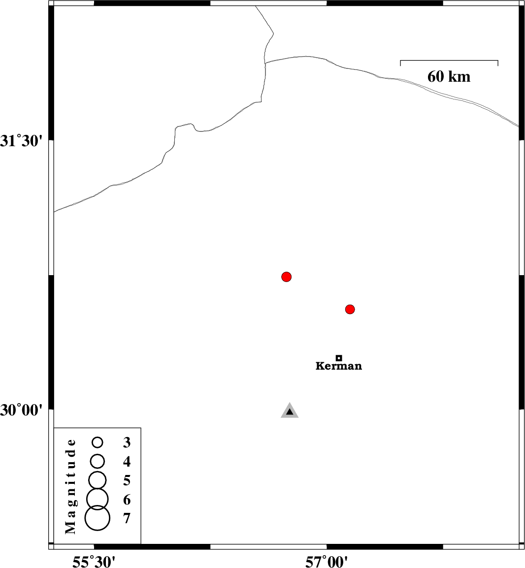 | 2007/03/20 | 22:25:46.2 | 01:55:46.2 | 30.56 | 57.15 | 14 | ML:2.7 | 31 km North of Kerman, Kerman Province |