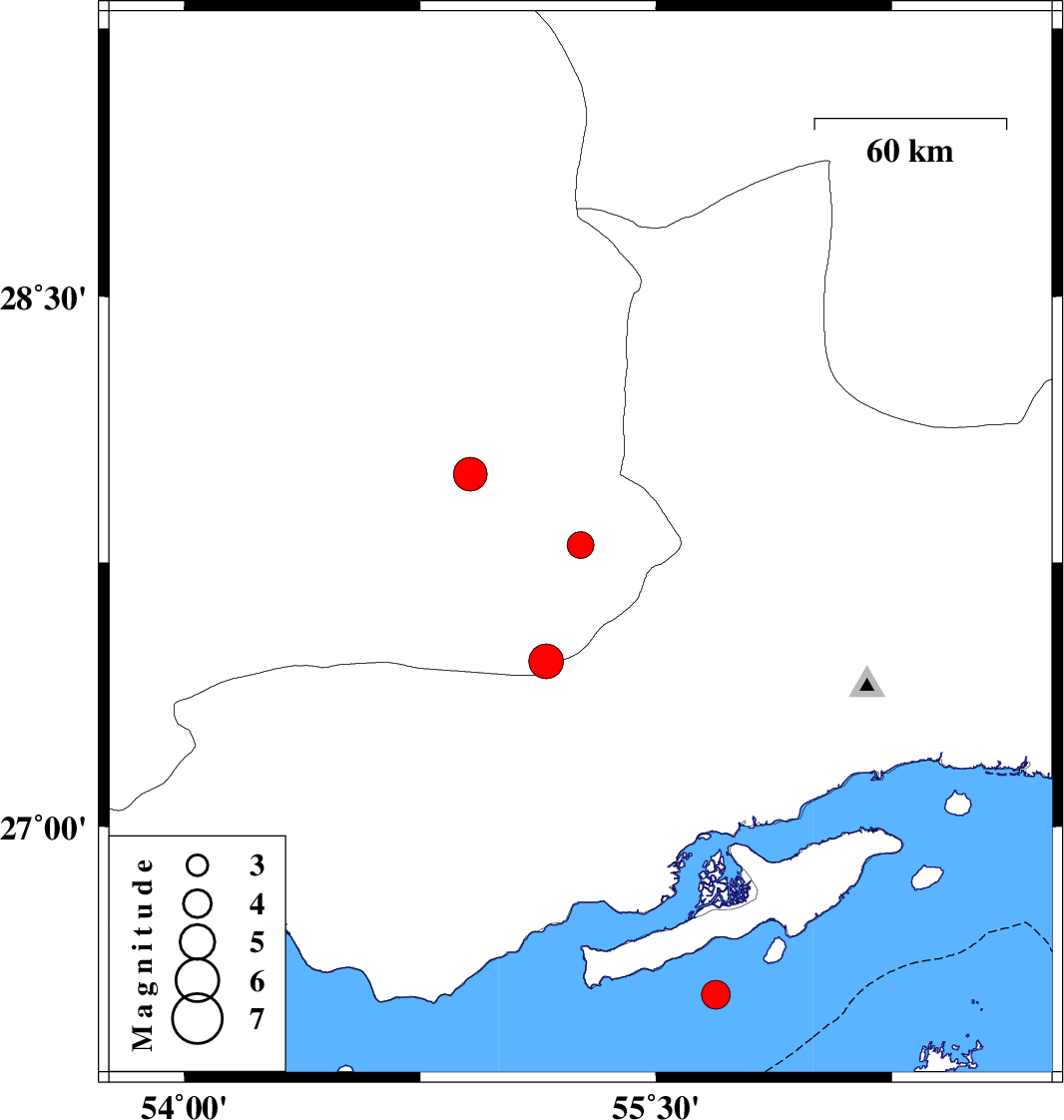 | 2007/03/10 | 18:15:31.0 | 21:45:31.0 | 26.52 | 55.69 | 15 | ML:4.1 | Persian Gulf, 75 km South-West of Qeshm | ||