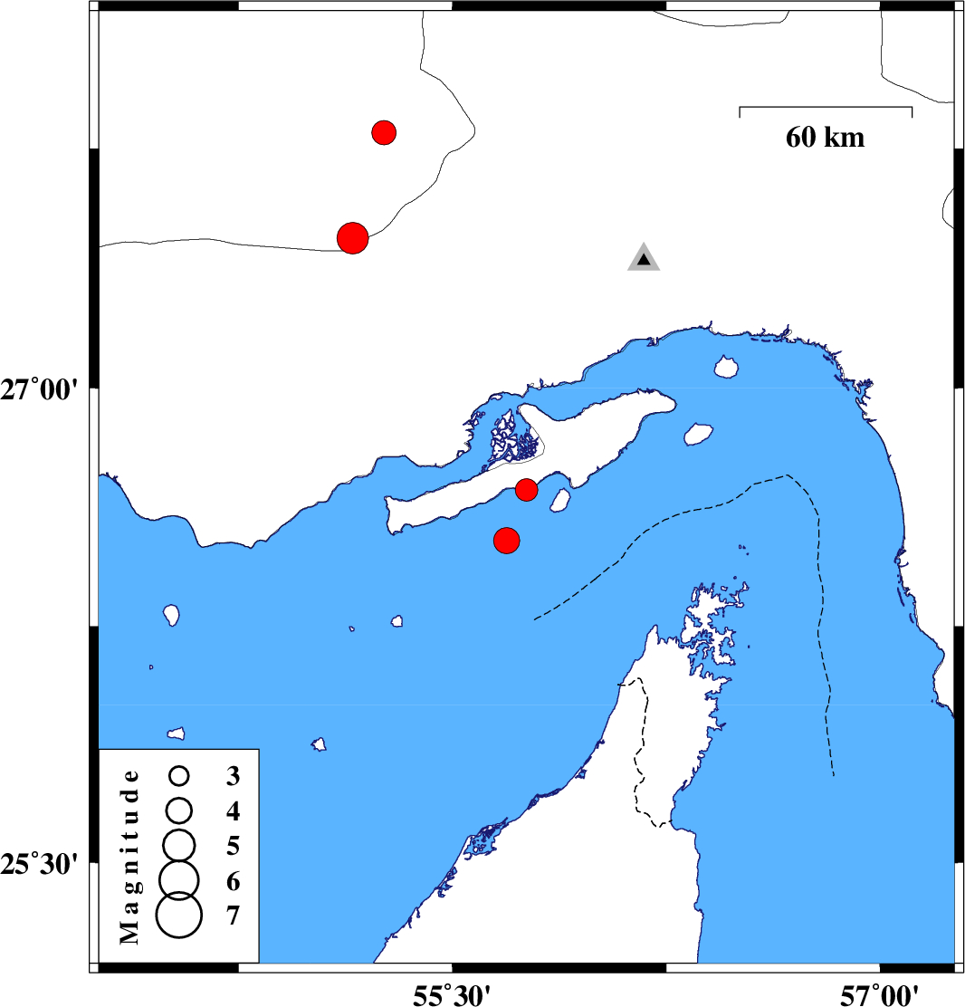 | 2007/03/10 | 18:15:31.0 | 21:45:31.0 | 26.52 | 55.69 | 15 | ML:4.1 | Persian Gulf, 75 km South-West of Qeshm |
