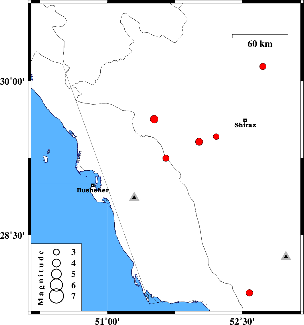 | 2007/04/17 | 12:20:39.4 | 15:50:39.4 | 29.46 | 52.21 | 18 | ML:3 | 35 km South-West of Shiraz, Fars Province |
