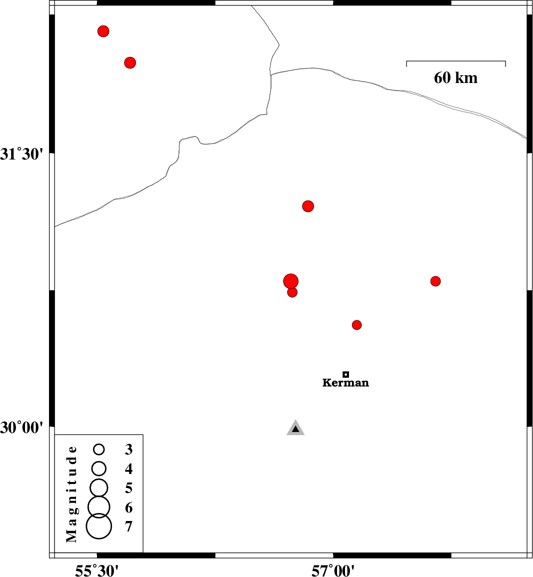 | 2007/03/09 | 18:15:12.0 | 21:45:12.0 | 30.8 | 57.65 | 14 | ML:2.8 | 79 km North-East of Kerman, Kerman Province |