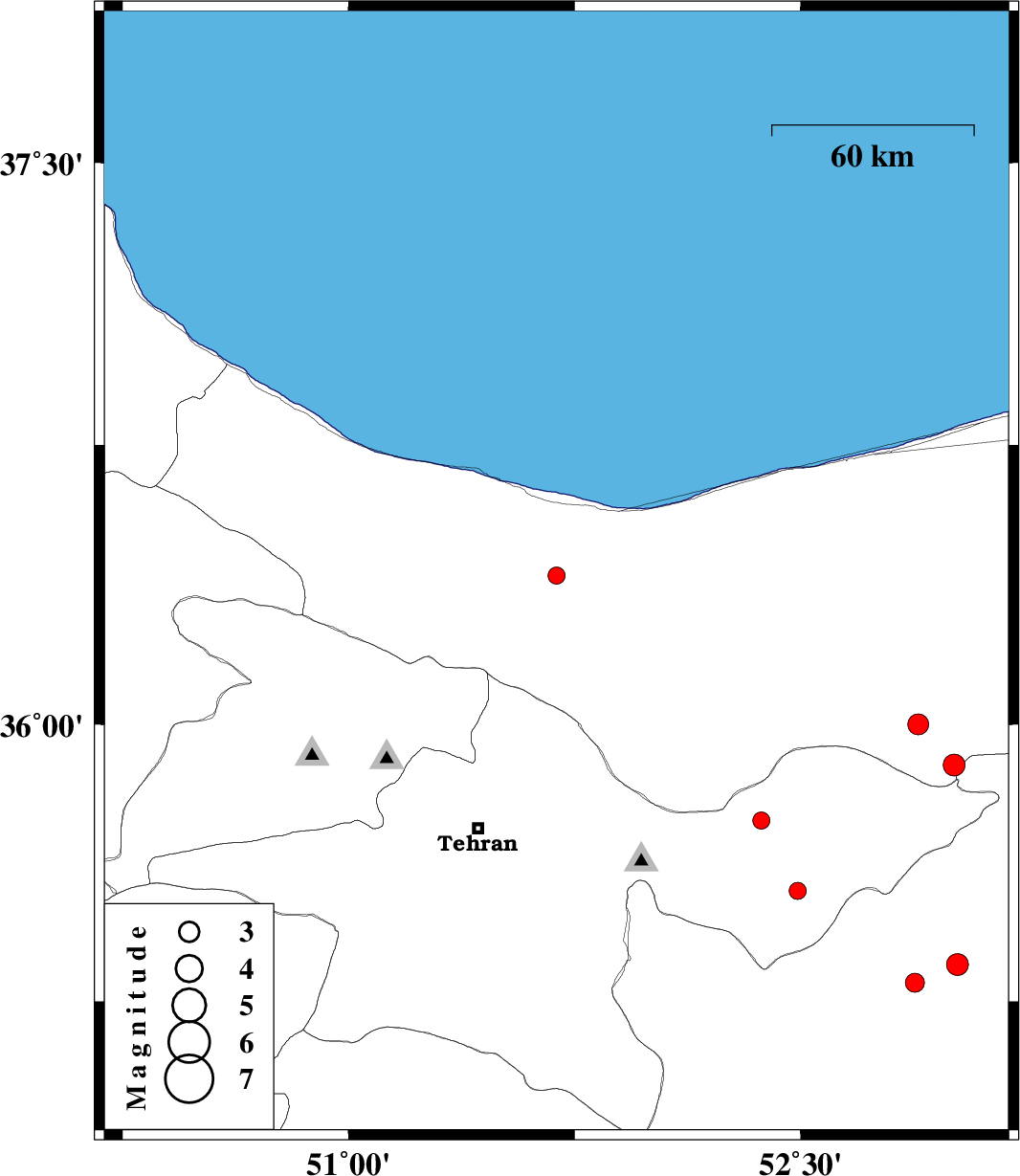 | 2007/04/29 | 05:36:09.7 | 09:06:09.7 | 35.74 | 52.37 | 6 | ML:2.6 | 27 km East of Damavand, Tehran Province | ||