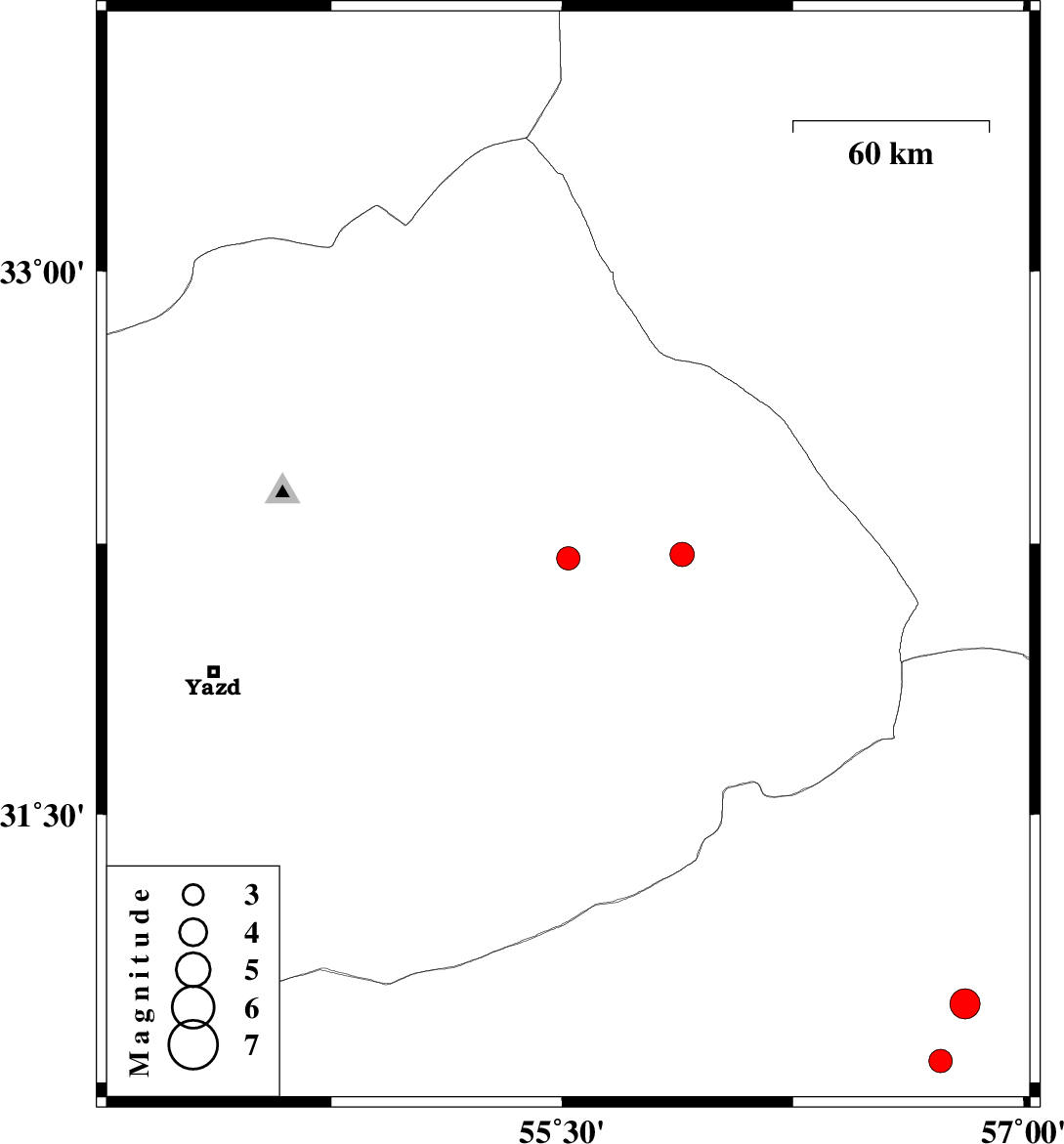 | 2007/05/03 | 00:03:23.1 | 03:33:23.1 | 32.21 | 55.52 | 14 | ML:3.4 | 68 km North-East of Bafq, Yazd Province | ||