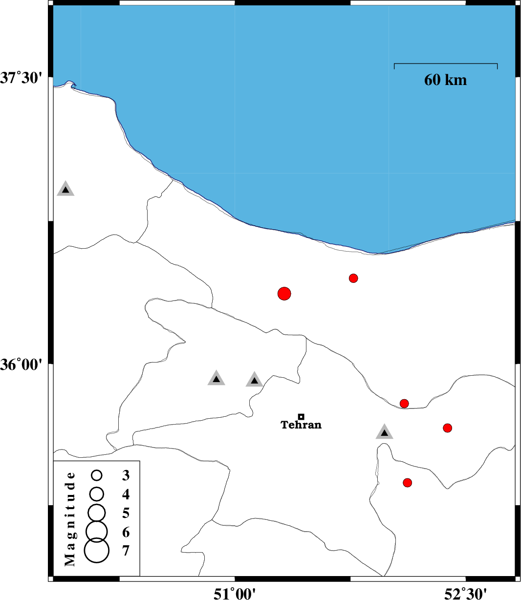 | 2007/05/06 | 15:55:36.6 | 19:25:36.6 | 35.66 | 52.38 | 8 | ML:2.6 | 28 km East of Damavand, Tehran Province |