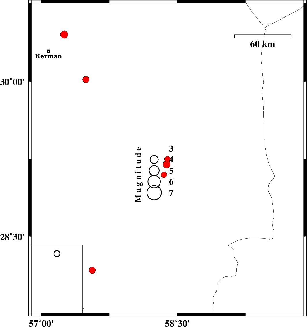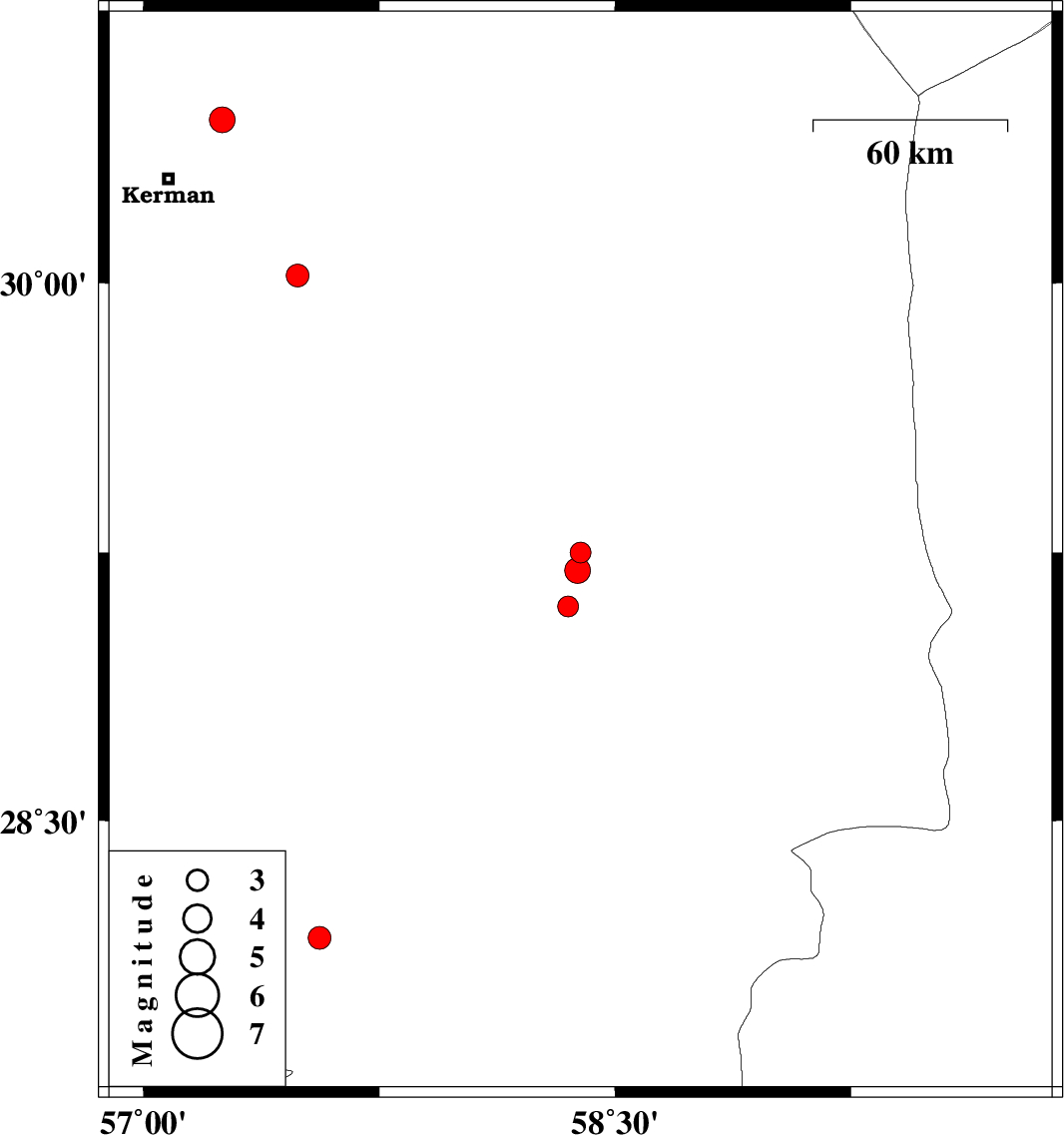 | 2007/05/09 | 10:46:36.7 | 14:16:36.7 | 29.2 | 58.38 | 14 | ML:3.6 | 9 km Bam, Kerman Province |