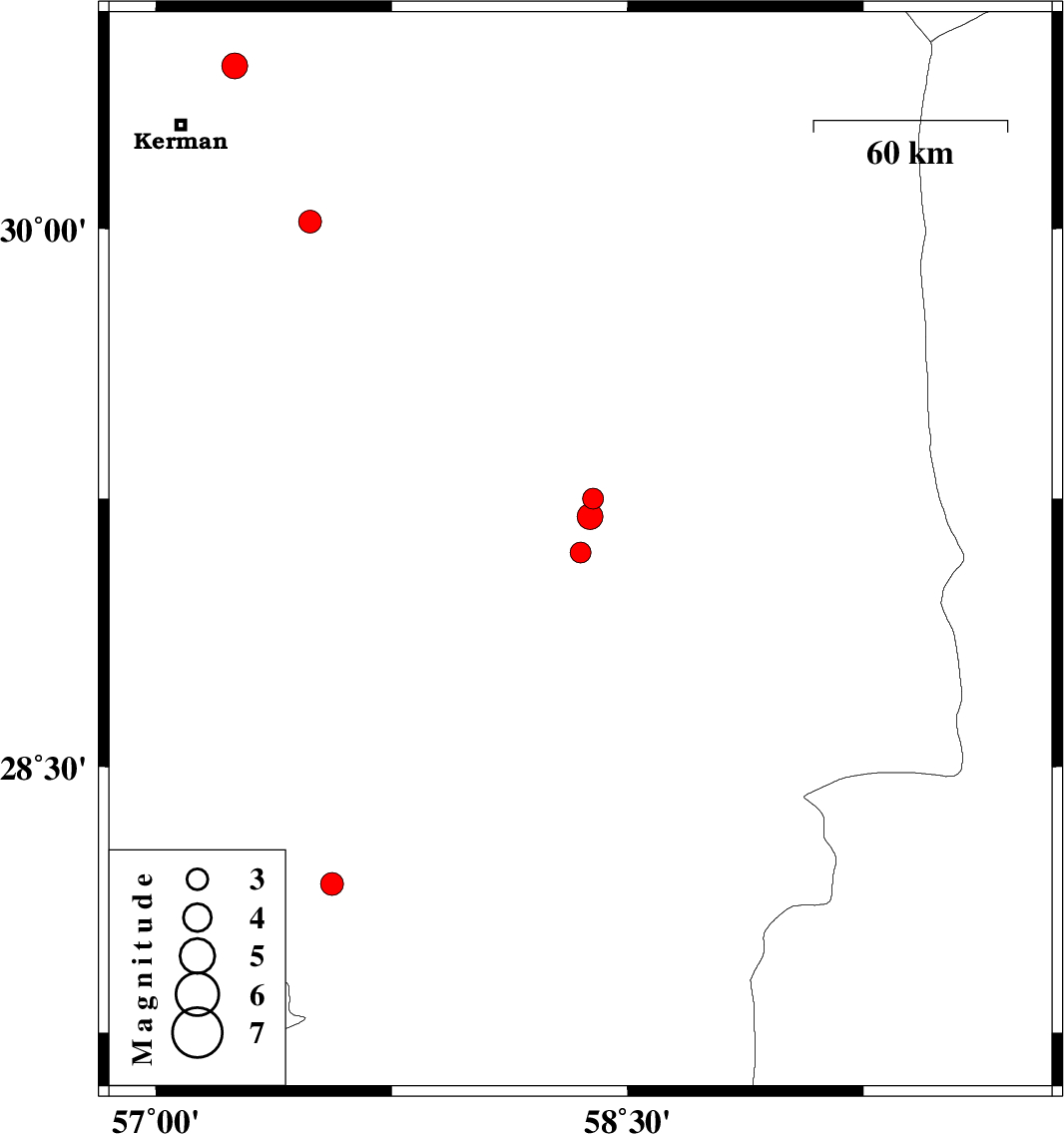 | 2007/05/09 | 10:46:36.7 | 14:16:36.7 | 29.2 | 58.38 | 14 | ML:3.6 | 9 km Bam, Kerman Province |