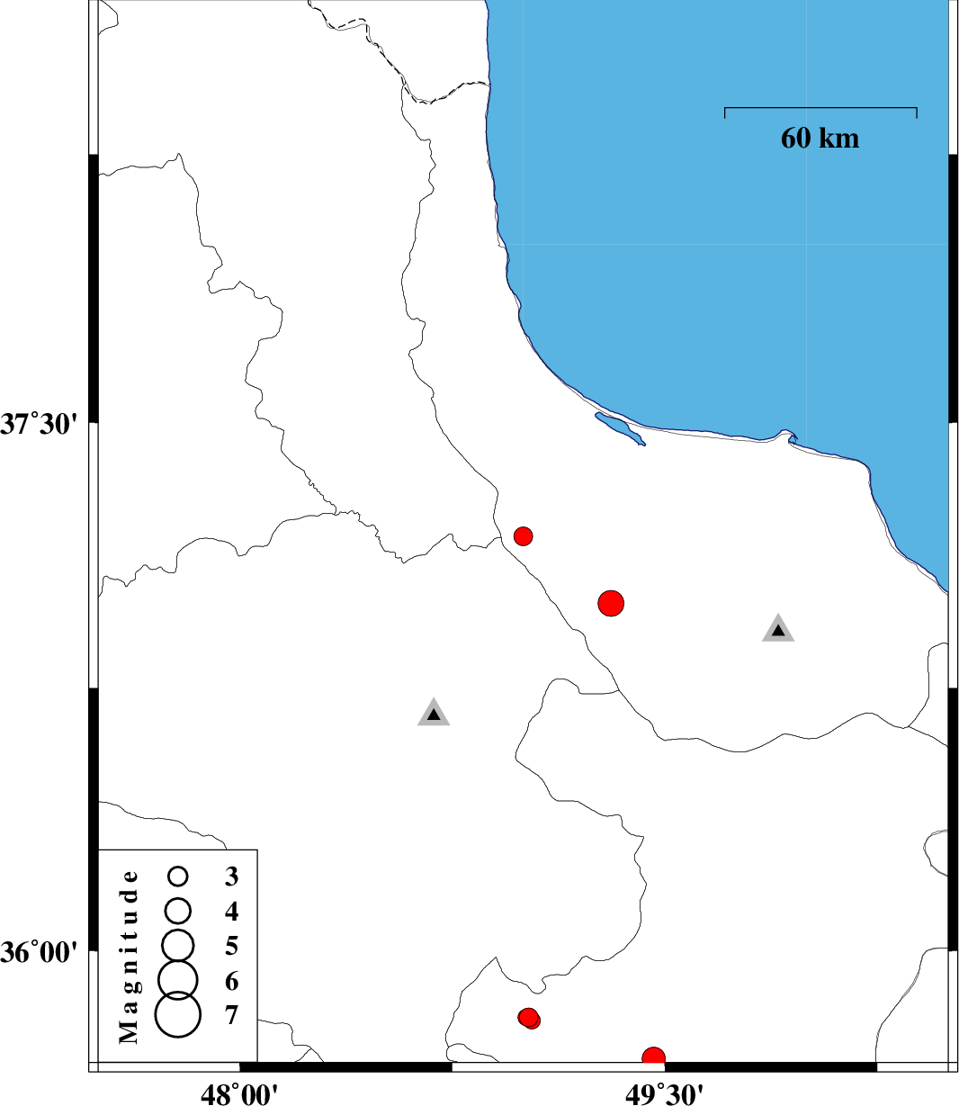 | 2007/06/06 | 23:10:56.8 | 02:40:56.8 | 37.18 | 49 | 16 | ML:3 | 27 km West of Fuman, Gilan Province | ||