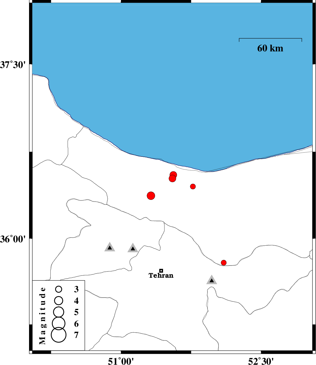 | 2007/05/23 | 01:39:37.4 | 05:09:37.4 | 36.45 | 51.77 | 14 | ML:2.6 | 27 km South-West of Nur, Mazandaran Province |
