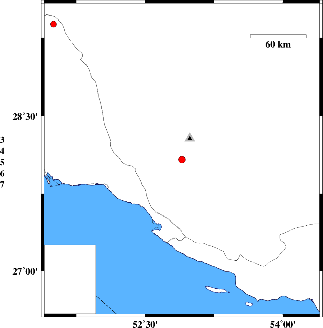 | 2007/06/02 | 06:25:49.4 | 09:55:49.4 | 29.38 | 51.5 | 15 | ML:3 | 30 km South-West of Kazerun, Fars Province |
