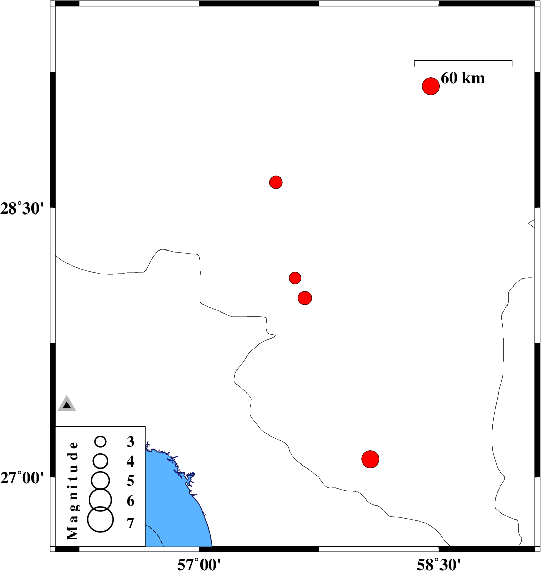 | 2007/04/08 | 01:19:17.0 | 04:49:17.0 | 28 | 57.66 | 14 | ML:3.8 | 6 km Kahnuj, Kerman Province | ||