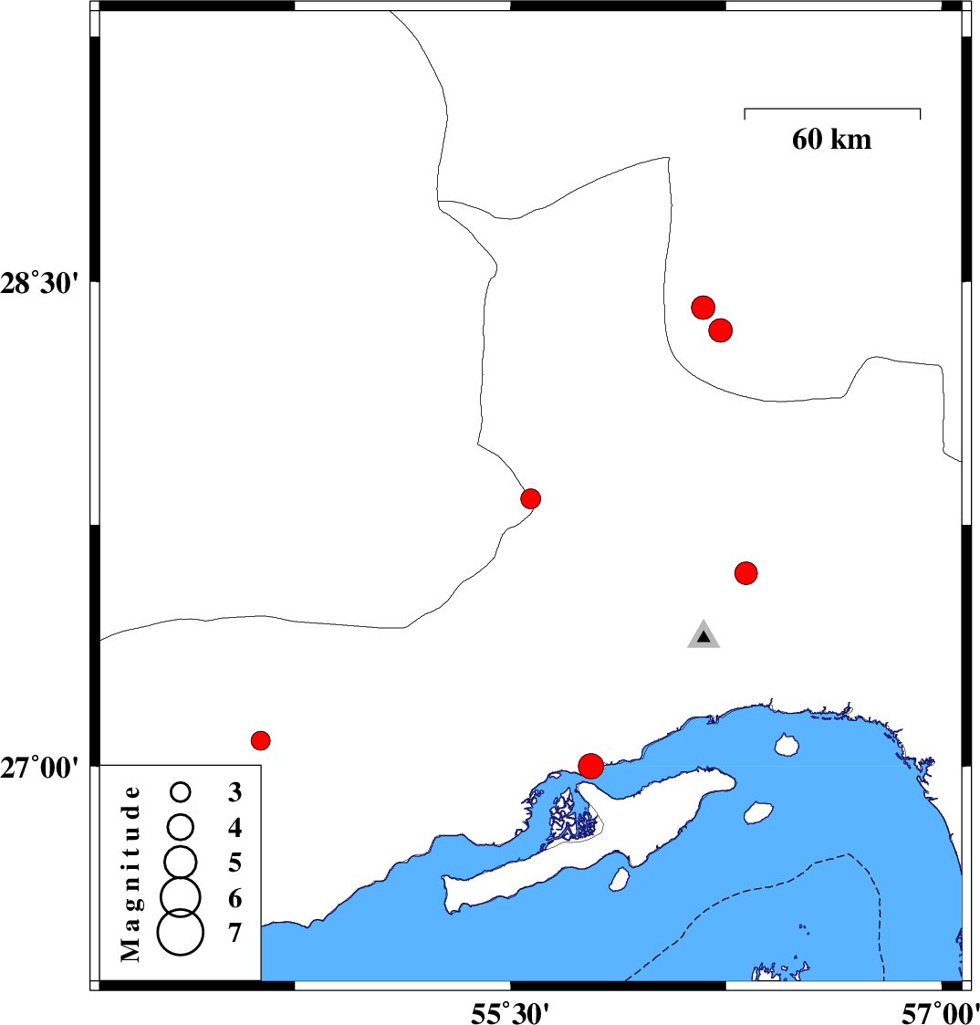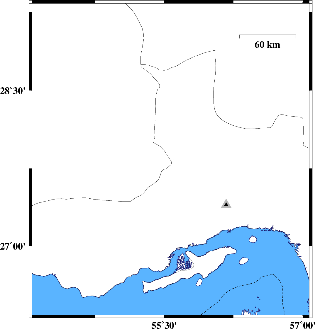 | 2007/05/01 | 07:51:27.6 | 11:21:27.6 | 27 | 55.78 | 2 | ML:3.9 | Persian Gulf, 48 km West of Qeshm |