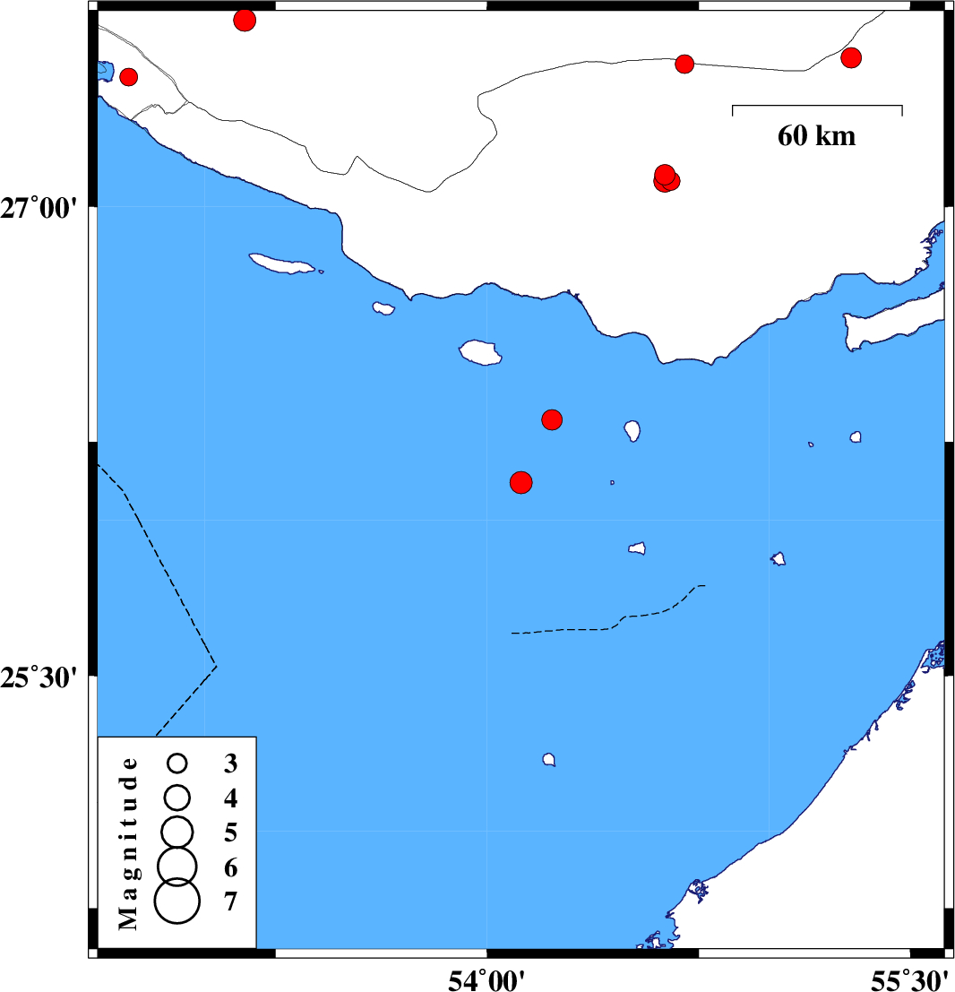 | 2007/06/10 | 18:19:07.2 | 21:49:07.2 | 26.12 | 54.12 | 14 | ML:3.5 | Persian Gulf, 85 km South-West of Bandar-e lengeh | ||