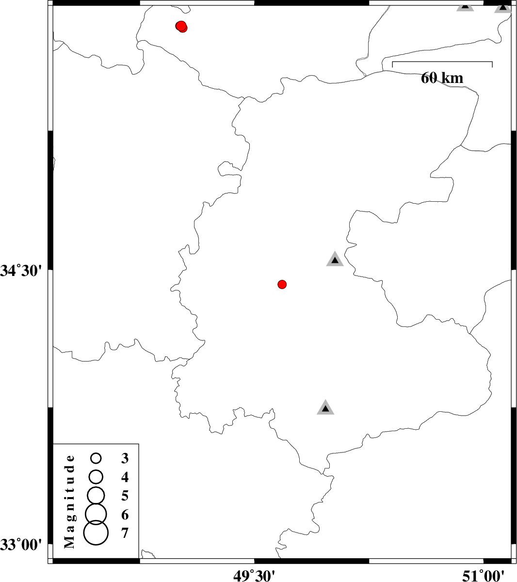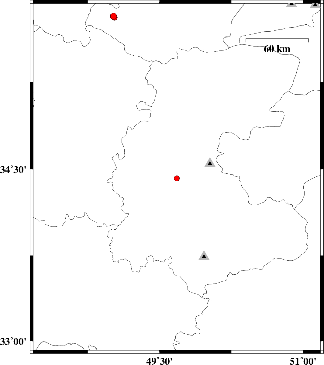 | 2007/05/11 | 11:05:51.7 | 14:35:51.7 | 34.42 | 49.68 | 15 | ML:2.6 | 31 km South-West of Ashtiyan, Markazi Province | ||