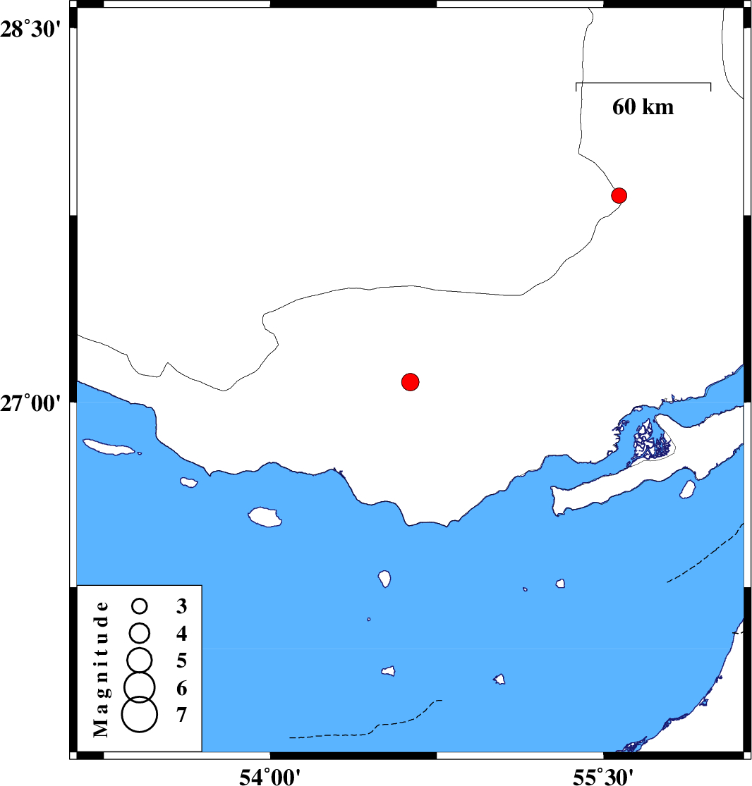 | 2007/05/12 | 08:17:27.5 | 11:47:27.5 | 27.08 | 54.63 | 46 | ML:3.5 | 29 km South-East of Bastak, Hormozgan Province | ||
