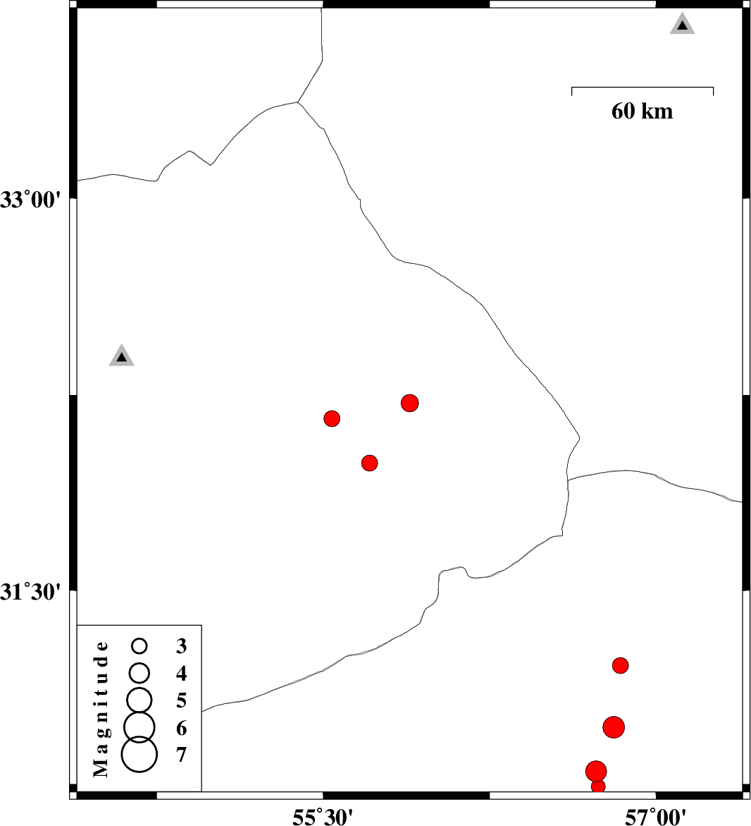 | 2007/03/13 | 09:38:18.6 | 13:08:18.6 | 32.16 | 55.54 | 14 | ML:3.2 | 62 km North-East of Bafq, Yazd Province | ||