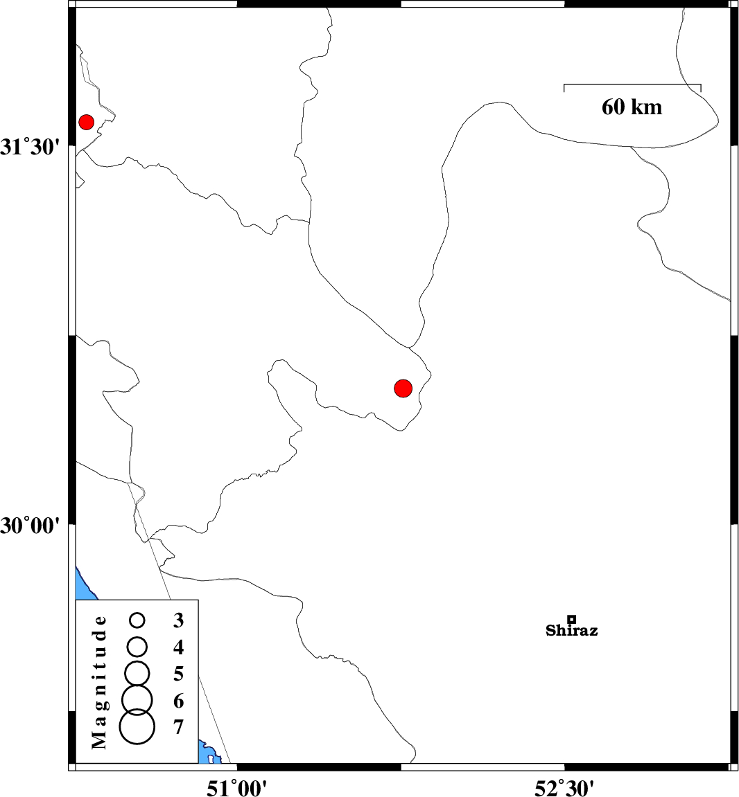 | 2007/06/14 | 02:09:55.1 | 05:39:55.1 | 30.54 | 51.76 | 14 | ML:3.7 | 23 km South-East of Yasuj, Kohkiluieh va boyerahmad Province | ||