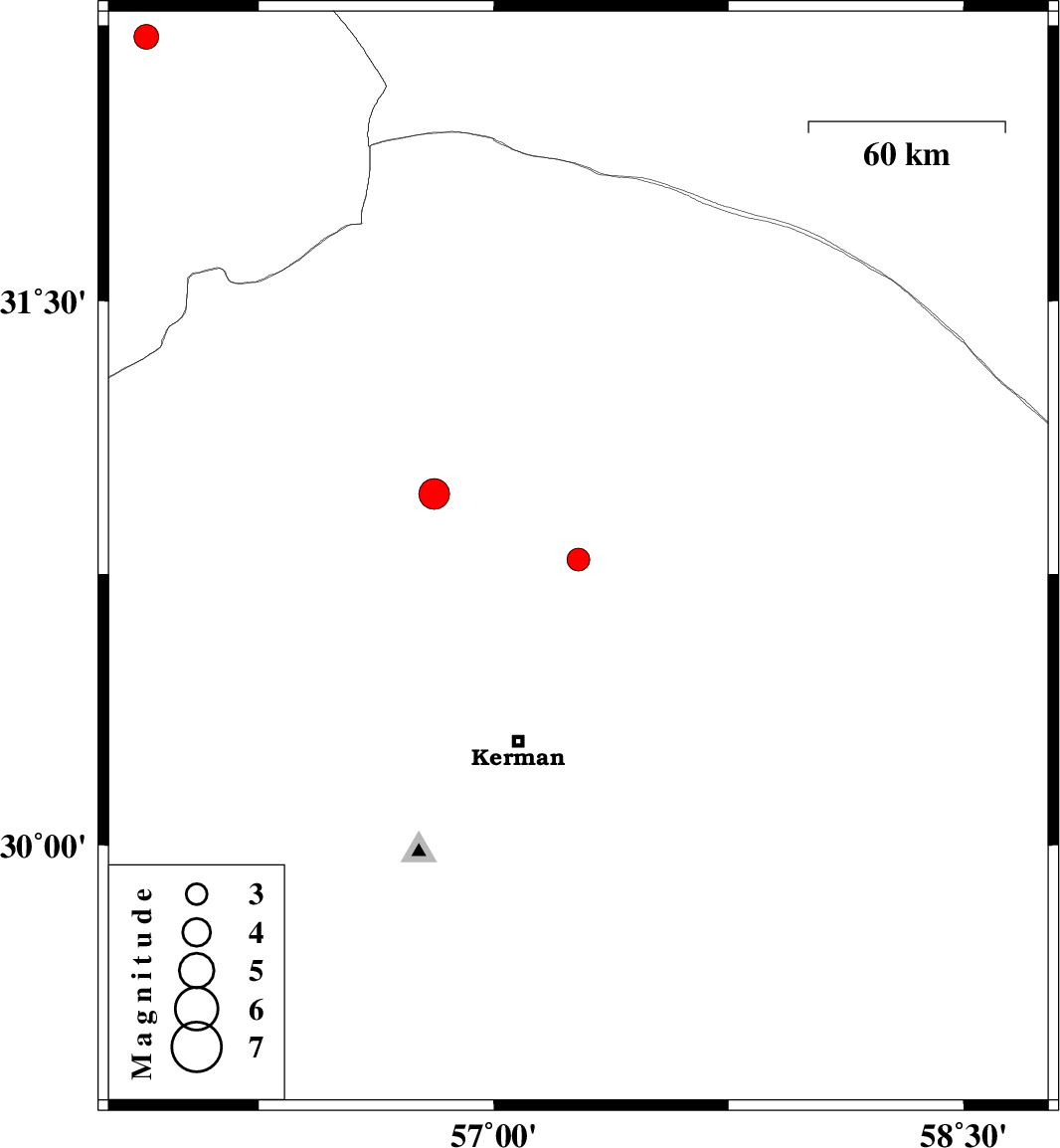 | 2007/04/14 | 13:06:40.3 | 16:36:40.3 | 30.79 | 57.27 | 15 | ML:3.2 | 59 km North-East of Kerman, Kerman Province | ||