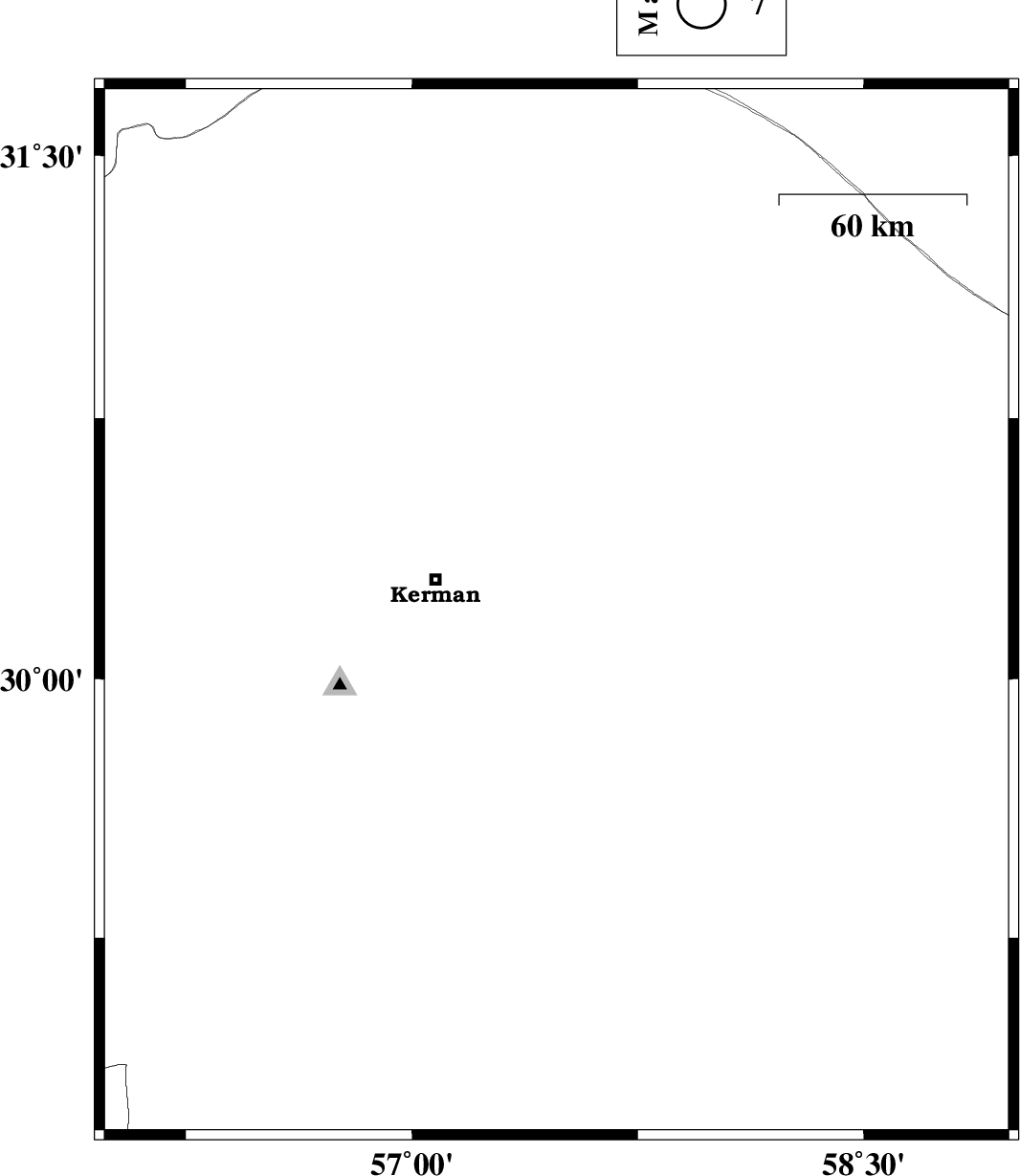 | 2007/06/11 | 05:31:34.1 | 09:01:34.1 | 30.06 | 57.41 | 1 | ML:3.1 | 41 km South-East of Kerman, Kerman Province |