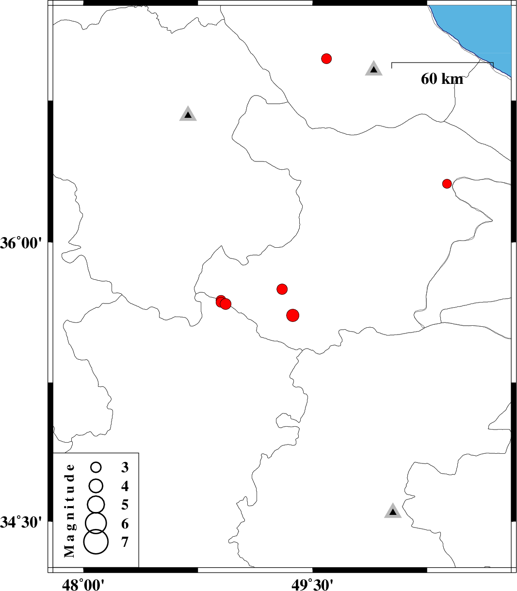 | 2007/03/20 | 09:22:48.0 | 12:52:48.0 | 36.97 | 49.59 | 14 | ML:3 | 22 km North-East of Rudbar, Gilan Province |