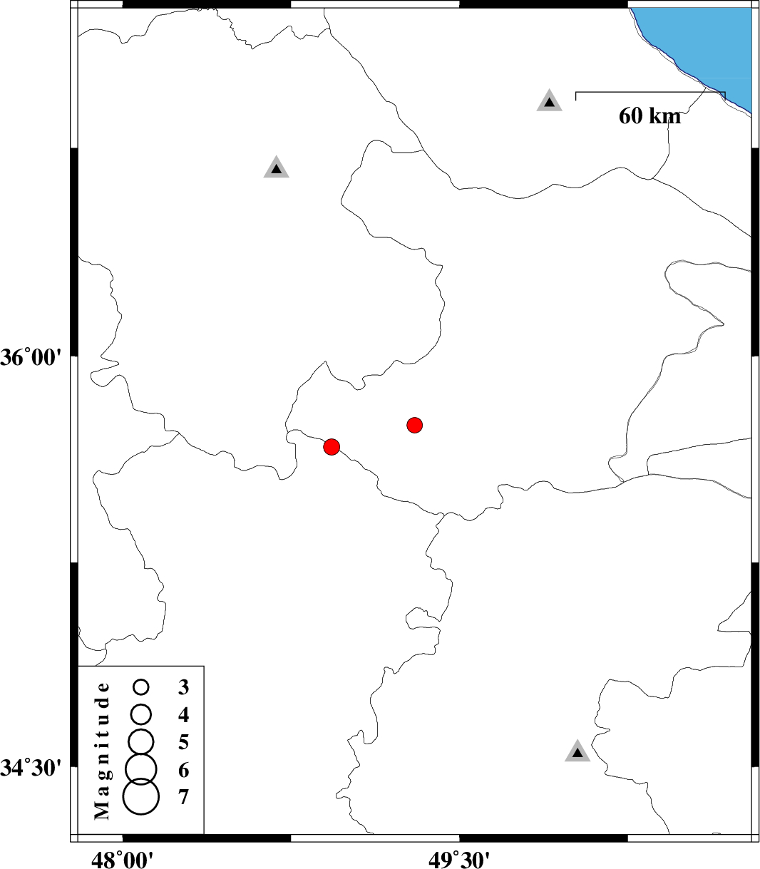 | 2007/04/15 | 04:24:21.0 | 07:54:21.0 | 35.67 | 48.93 | 14 | ML:3.2 | 33 km North-West of Razan, Hamedan Province |