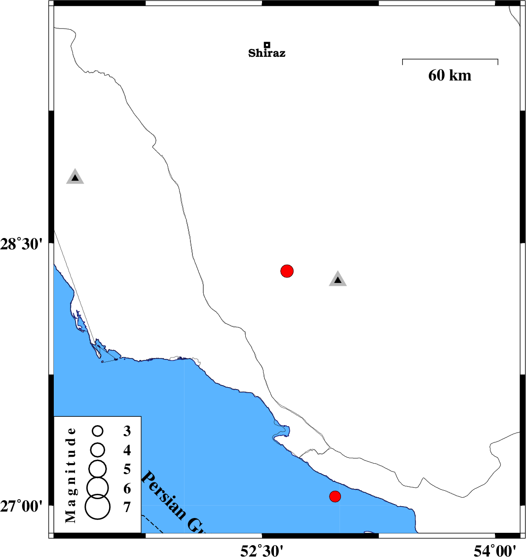 | 2007/06/17 | 10:38:13.3 | 14:08:13.3 | 27.05 | 52.97 | 24 | ML:3.3 | Persian Gulf, 37 km South-West of Lamerd |