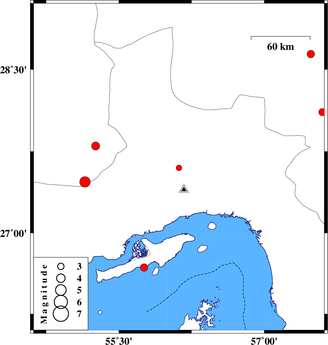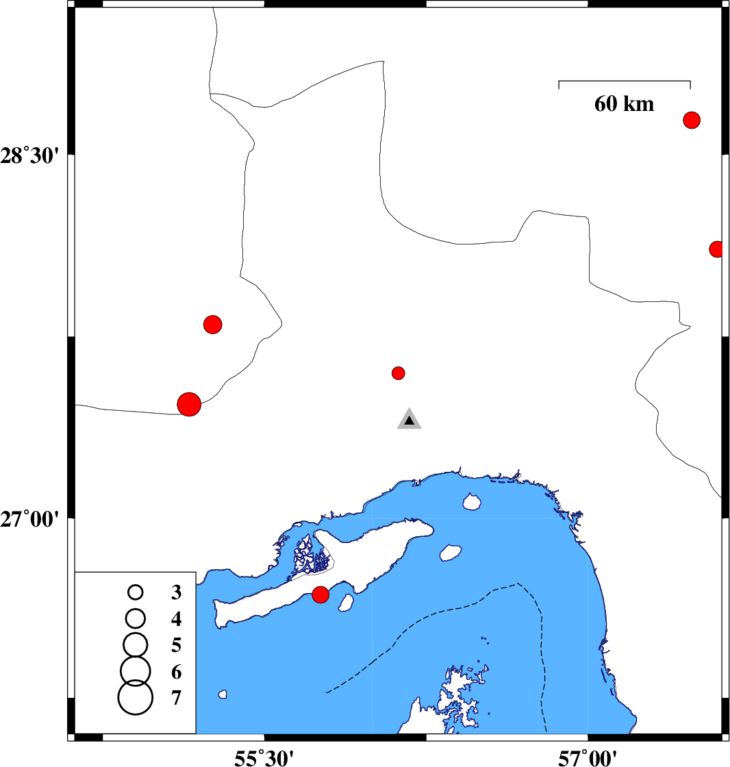 | 2007/04/01 | 07:34:44.0 | 11:04:44.0 | 26.68 | 55.76 | 15 | ML:3.5 | Persian Gulf, 58 km South-West of Qeshm | ||